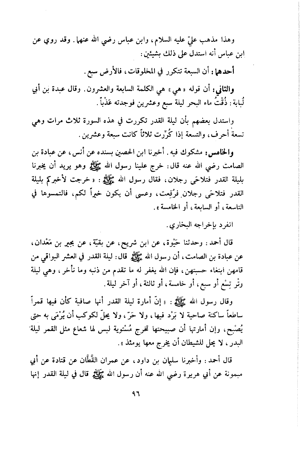وَالْخَامِسُ: مَشْكُوكٌ فِيهِ. أَخْبَرَنَا ابْنُ الْحُصَيْنِ بِسَنَدِهِ عَنْ أَنَسٍ عَنْ عُبَادَةَ بْنِ الصَّامِتِ رَضِيَ اللَّهُ عَنْهُ قَالَ: خَرَجَ عَلَيْنَا رَسُولُ اللَّهِ صَلَّى اللَّهُ عَلَيْهِ وَسَلَّمَ وَهُوَ يُرِيدُ أَنْ يُخْبِرَنَا بِلَيْلَةِ الْقَدْرِ فَتَلاحَى رَجُلانِ فَقَالَ رَسُولُ اللَّهِ صَلَّى اللَّهُ عَلَيْهِ وَسَلَّمَ: " خَرَجْتُ لأُخْبِرَكُمْ بِلَيْلَةِ الْقَدْرِ فَتَلاحَى رَجُلانِ فَرُفِعَتْ وَعَسَى أَنْ يَكُونَ خَيْرًا لَكُمْ، فَالْتَمِسُوهَا فِي التَّاسِعَةِ أَوِ السَّابِعَةِ أَوِ الْخَامِسَةِ ".