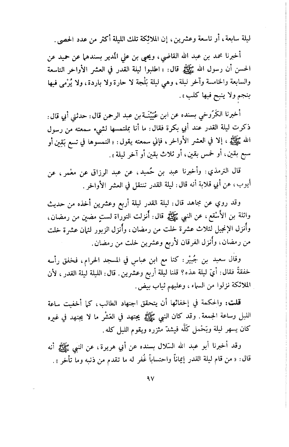 وَالسَّابِعَةِ وَالْخَامِسَةِ وَآخِرِ لَيْلَةٍ، وَهِيَ لَيْلَةٌ بَلْجَةٌ لا حَارَّةٌ وَلا بَارِدَةٌ وَلا يُرْمَى فِيهَا بِنَجْمٍ وَلا يَنْبَحُ فِيهَا كَلْبٌ ".