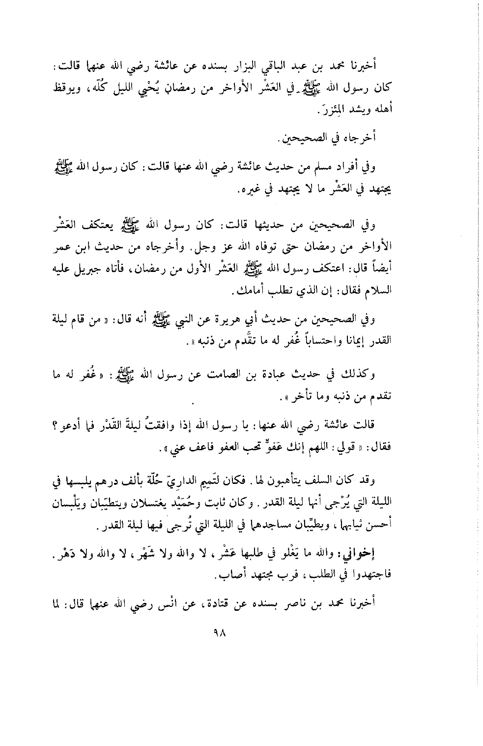 وَفِي الصَّحِيحَيْنِ مِنْ حَدِيثِهَا قَالَتْ: كَانَ رَسُولُ اللَّهِ صَلَّى اللَّهُ عَلَيْهِ وَسَلَّمَ يَعْتَكِفُ الْعَشْرَ الأَوَاخِرَ مِنْ رَمَضَانَ حَتَّى تَوَفَّاهُ اللَّهُ عَزَّ وَجَلَّ. وَأَخْرَجَاهُ مِنْ حديث ابن عمر قَالَ: اعْتَكَفَ رَسُولُ اللَّهِ صَلَّى اللَّهُ عَلَيْهِ وَسَلَّمَ الْعَشْرَ الأُوَلَ مِنْ رَمَضَانَ فَأَتَاهُ جِبْرِيلُ عَلَيْهِ السَّلامُ فَقَالَ: إِنَّ الَّذِي تَطْلُبُ أَمَامَكَ.