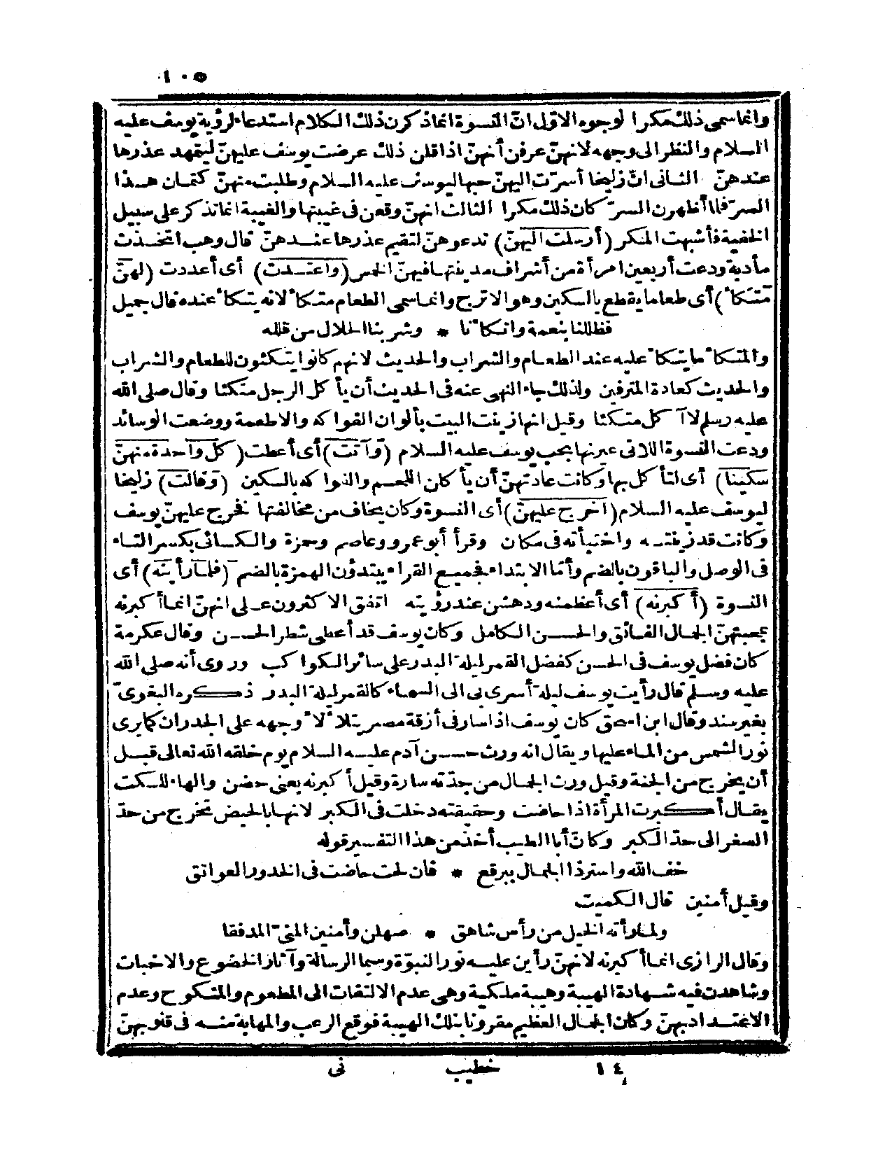 وروي أنه صلى الله عليه وسلم قال: «رأيت يوسف ليلة أسري بي إلى السماء كالقمر ليلة البدر» ذكره البغويّ بغير سند، وقال ابن إسحاق: كان يوسف إذا سار في أزقة مصر يتلألأ وجهه على الجدران كما يرى نور الشمس من الماء عليها ويقال: إنه ورث حسن آدم عليه السلام يوم خلقه الله تعالى قبل أن يخرج من الجنة، وقيل: ورث الجمال من جدّته سارة، وقيل: أكبرنه يعني حضن، والهاء للسكت يقال: أكبرت المرأة إذا حاضت، وحقيقته دخلت في الكبر؛ لأنها بالحيض تخرج من حدّ الصغر إلى حدّ الكبر، وكأنّ أبا الطيب أخذ من هذا التفسير قوله: