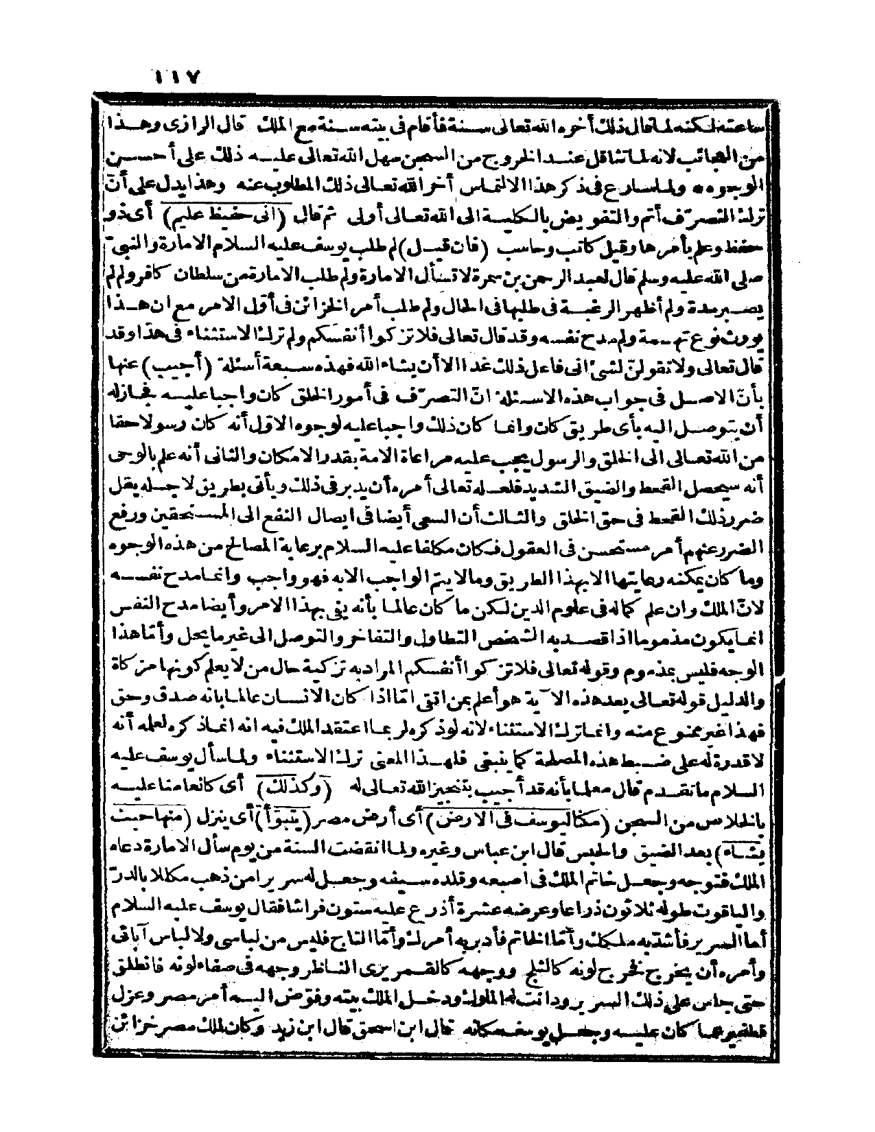 والثالث: أن السعي أيضاً في إيصال النفع إلى المستحقين ورفع الضرر عنهم أمر مستحسن في العقول، فكان مكلفاً عليه السلام برعاية المصالح من هذه الوجوه، وما كان يمكنه رعايتها إلا بهذا الطريق، وما لا يتم الواجب إلا به فهو واجب، وإنما مدح نفسه؛ لأنّ الملك وإن علم كماله في علوم الدين لكن ما كان عالماً بأنه يفي بهذا الأمر، وأيضاً مدح النفس إنما يكون مذموماً إذا قصد به الشخص التطاول والتفاخر والتوصل إلى غير ما يحل، وأمّا هذا الوجه فليس بمذموم وقوله تعالى {فلا تزكوا أنفسكم} (النجم، 32) المراد به تزكية حال من لا يعلم كونها مزكاة والدليل قوله تعالى بعد هذه الآية: {هو أعلم بمن اتقى} (النجم، 32) أمّا إذا كان الإنسان عالماً بأنه صدق وحق فهذا غير ممنوع منه، وإنما ترك الاستثناء؛ لأنه لو ذكره بما اعتقد الملك فيه إنه إنما ذكره لعلمه أنه لا قدرة له على ضبط هذه المصلحة كما ينبغي، فلهذا المعنى ترك الاستثناء، ولما سأل يوسف عليه السلام ما تقدم قال معلماً بأنه قد أجيب بتنجيز الله تعالى له:
