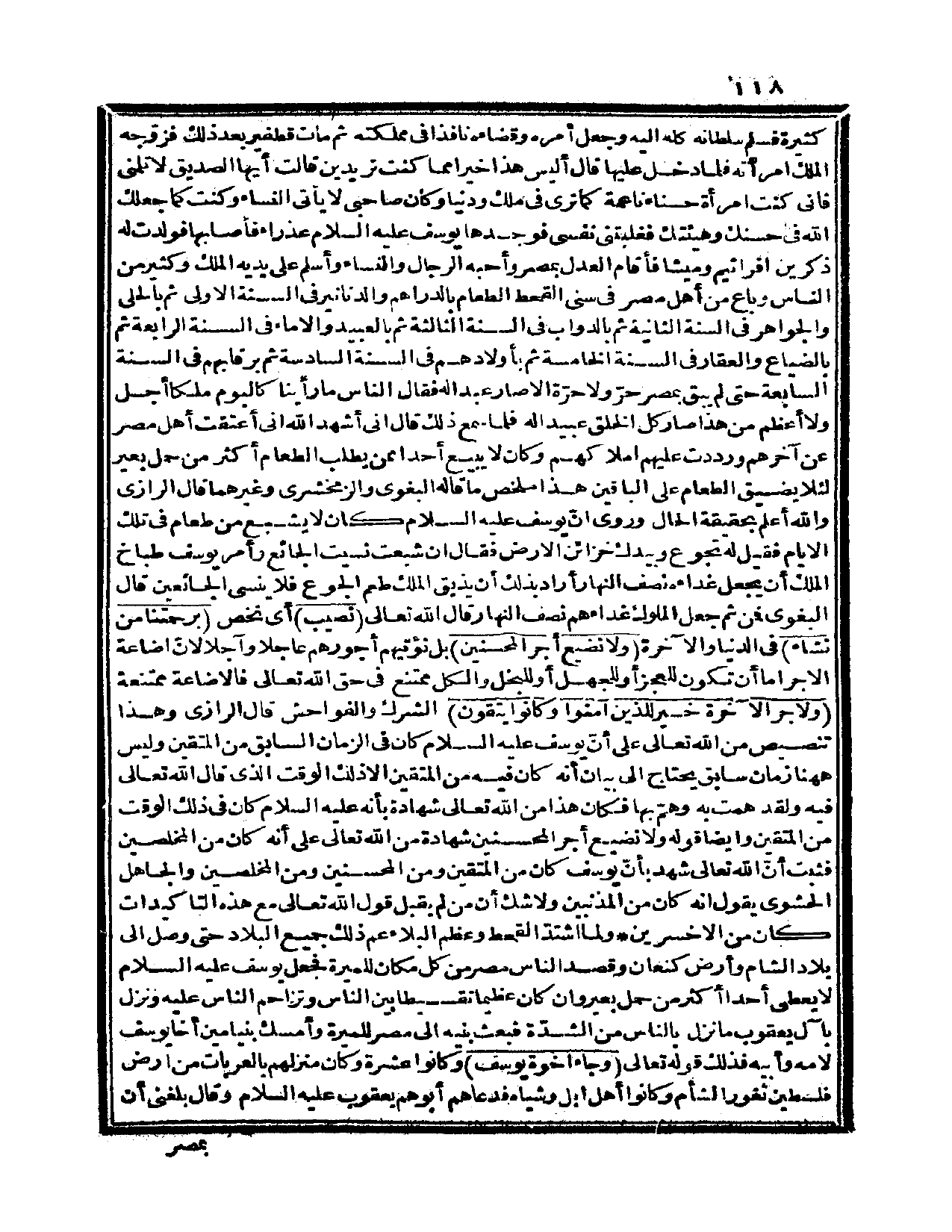 كثيرة فسلم سلطانه كله إليه وجعل أمره وقضاءه نافذاً في مملكته، ثم مات قطفير بعد ذلك فزوّجه الملك امرأته، فلما دخل عليها قال: أليس هذا خيراً مما كنت تريدين؟ قالت: أيها الصديق لا تلمني، فإني كنت امرأة حسناء ناعمة كما ترى في ملك ودنيا وكان صاحبي لا يأتي النساء، وكنت كما جعلك الله في حسنك وهيئتك فغلبتني نفسي، فوجدها يوسف عليه السلام عذراء فأصابها فولدت له ذكرين افراثيم وميشا، فأقام العدل بمصر وأحبه الرجال والنساء، وأسلم على يديه الملك وكثير من الناس وباع من أهل مصر في سني القحط الطعام بالدراهم والدنانير في السنة الأولى، ثم بالحلي والجواهر في السنة الثانية، ثم بالدواب في السنة الثالثة، ثم بالعبيد والإماء في السنة الرابعة، ثم بالضياع والعقار في السنة الخامسة، ثم بأولادهم في السنة السادسة، ثم برقابهم في السنة السابعة حتى لم يبق بمصر حرّ ولا حرّة إلا صار عبداً له، فقال الناس: ما رأينا كاليوم ملكاً أجل ولا أعظم من هذا صار كل الخلق عبيداً له، فلما سمع ذلك قال: إني أشهد الله أني اعتقت أهل مصر عن آخرهم ورددت عليهم أملاكهم، وكان لا يبيع أحداً ممن يطلب الطعام أكثر من حمل بعير؛ لئلا يضيق الطعام على الباقين هذا ملخص ما قاله البغوي والزمخشري وغيرهما.