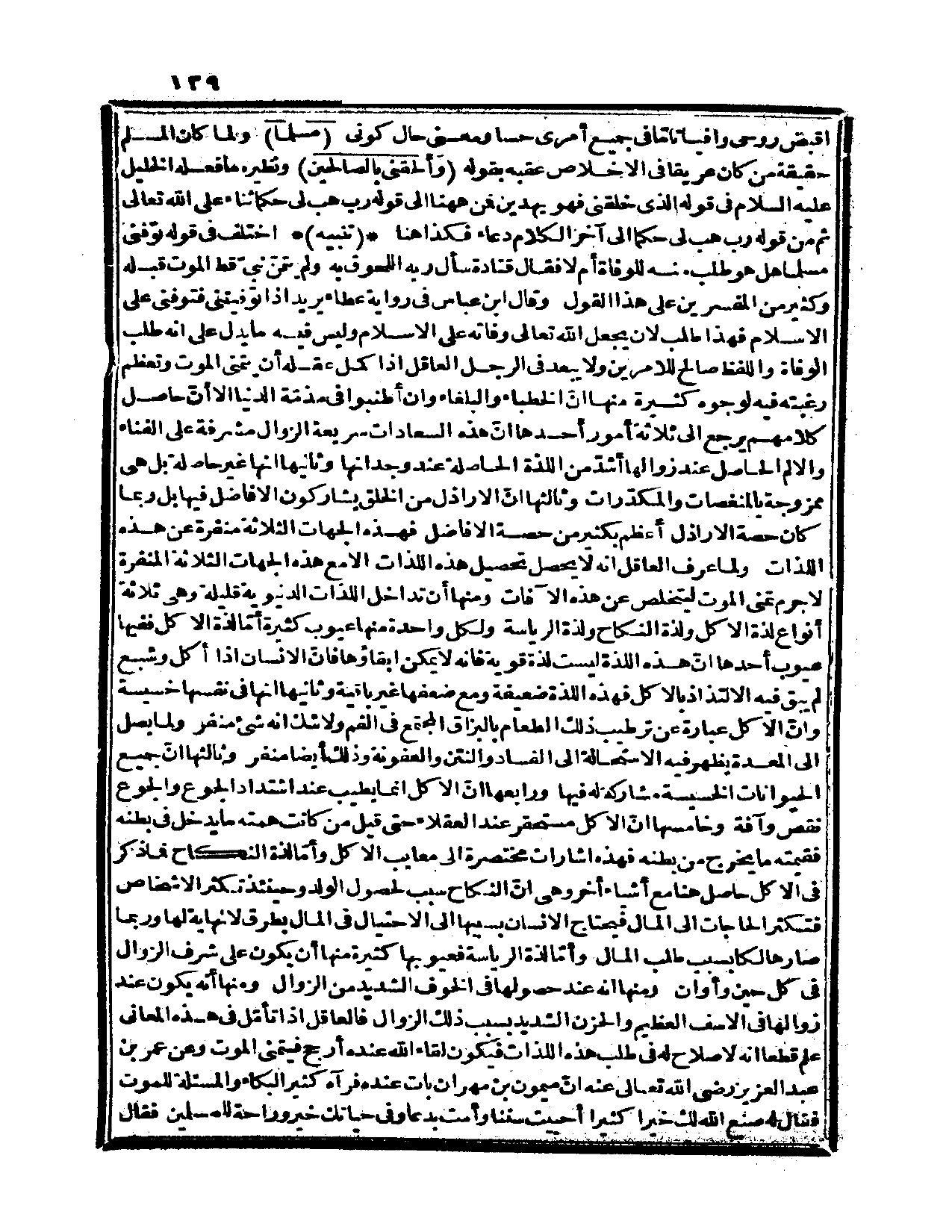 وثالثها: أنّ الأراذل من الخلق يشاركون الأفاضل فيها، بل ربما كان حصة الأراذل أعظم بكثير من حصة الأفاضل، فهذه الجهات الثلاثة منفرة عن هذه اللذات، ولما عرف العاقل أنه لا يحصل تحصيل هذه اللذات إلا مع هذه الجهات الثلاثة المنفرة لا جرم تمنى الموت ليتخلص عن هذه الآفات، ومنها: أن تداخل اللذات الدنيوية قليلة وهي ثلاثة أنواع: لذة الأكل ولذة النكاح ولذة الرياسة، ولكل واحدة منها عيوب كثيرة، أمّا لذة الأكل ففيها عيوب أحدها: أنّ هذه اللذة ليست لذة قوية، فإنه لا يمكن إبقاؤها، فإنّ الإنسان إذا أكل وشبع لم يبق فيه الالتذاذ، بالأكل، فهذه اللذة ضعيفة، ومع ضعفها غير باقية: وثانيها: أنها في نفسها خسيسة وأنّ الأكل عبارة عن ترطيب ذلك الطعام بالبزاق المجتمع في الفم، ولا شك أنه شيء منفر، ولما يصل إلى المعدة يظهر فيه الاستحالة إلى الفساد والنتن والعفونة، وذلك أيضاً منفر، وثالثها: أنّ جميع الحيوانات الخسيسة مشاركة له فيها، ورابعها: أنّ الأكل إنما يطيب عند اشتداد الجوع، والجوع نقص وآفة، وخامسها: أنّ الأكل مستحقر عند العقلاء حتى قيل: من كانت همته ما يدخل في بطنه فقيمته ما يخرج من بطنه، فهذه إشارات مختصرة إلى معايب الأكل، وأمّا لذة النكاح فما ذكر في الأكل حاصل هنا مع أشياء أخر، وهي أنّ النكاح سبب لحصول الولد، وحينئذ تكثر الأشخاص فتكثر الحاجات إلى المال، فيحتاج الإنسان بسببها إلى الاحتيال في المال بطرق لا نهاية لها، وربما صار هالكاً بسبب طلب المال.