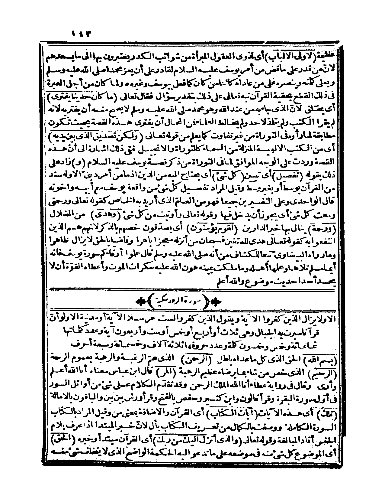 إلا {ولا يزال الذين كفروا} الآية {ويقول الذين كفروا لست مرسلاً} الآية أو مدنية إلا {ولو أنّ قرآنا سيرت به الجبال} وهي ثلاث أو أربع أو خمس أو ست وأربعون آية وعدد كلماتها وخمس وخمسون كلمة وعدد حروفها ثلاثة آلاف وسبعة أحرف.