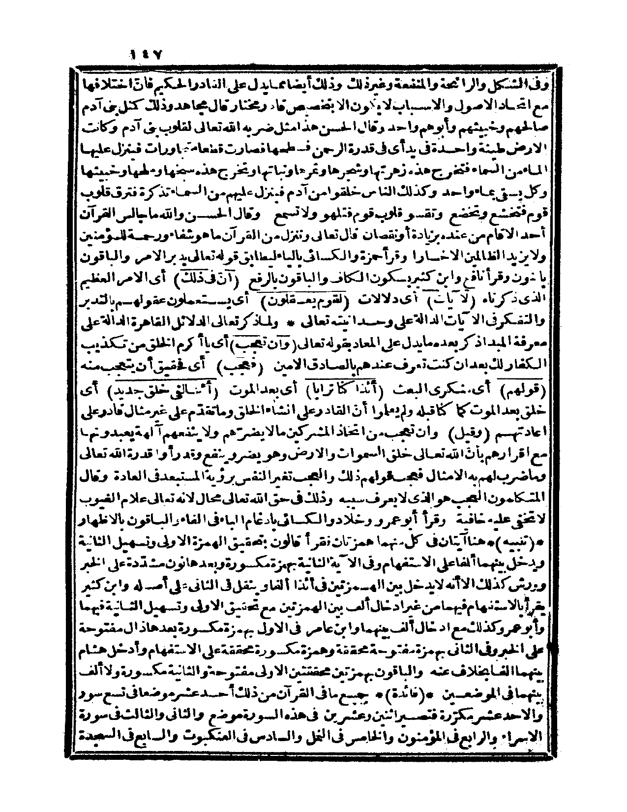 وقال الحسن: والله ما جالس القرآن أحد إلا قام من عنده بزيادة أو نقصان قال تعالى: {وننزل من القرآن ما هو شفاء ورحمة للمؤمنين ولا يزيد الظالمين إلا خساراً} (الإسراء، 82) وقرأ حمزة والكسائي بالياء ليطابق قوله تعالى: {يدبر الأمر} والباقون بالنون وقرأ نافع وابن كثير بسكون الكاف، والباقون بالرفع {إن في ذلك} ، أي: الأمر العظيم الذي ذكرناه {لآيات} ، أي: دلالات {لقوم يعقلون} ، أي: يستعملون عقولهم بالتدبر والتفكر في الآيات الدالة على وحدانيته تعالى.