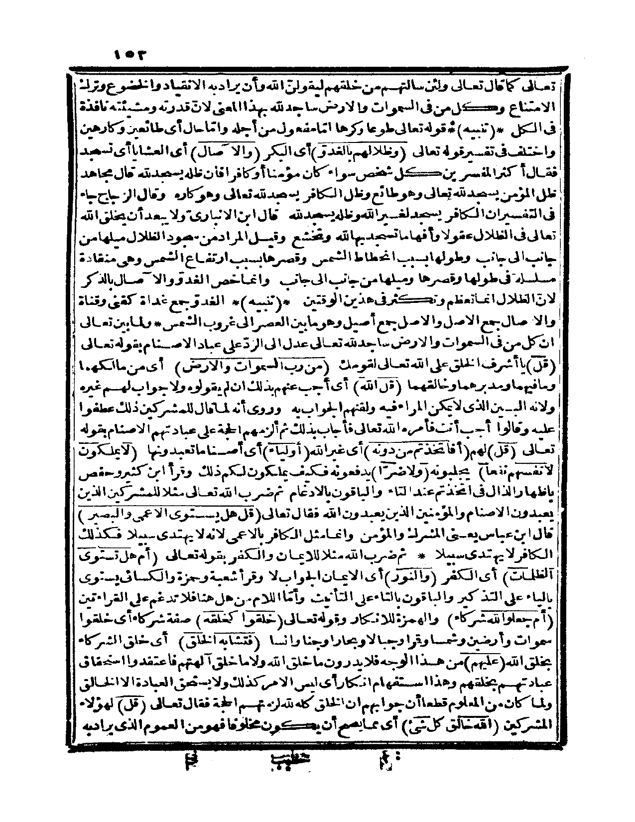 تعالى كما قال تعالى: {ولئن سألتهم من خلقهم ليقولنّ الله} (الزخرف، 87) وأن يراد به الانقياد والخضوع وترك الامتناع، وكل من في السموات والأرض ساجد لله بهذا المعنى؛ لأنّ قدرته ومشيئته نافذة في الكل.