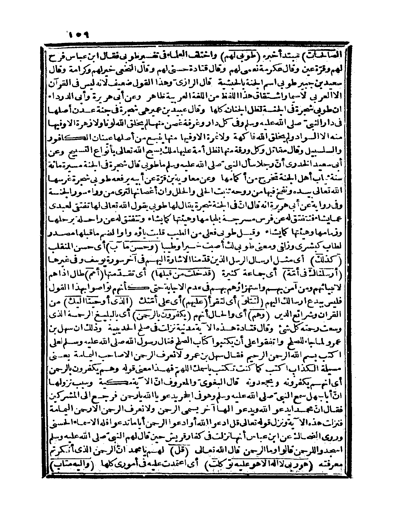 الصالحات} مبتدأ خبره {طوبى لهم} واختلف العلماء في تفسير طوبى فقال ابن عباس: فرح لهم وقرة عين. وقال عكرمة: نعمى لهم. وقال قتادة: حسنى لهم. وقال النخعي: خير لهم وكرامة. وقال سعيد بن جبير: طوبى اسم الجنة بالحبشية. قال الرازي: وهذا القول ضعيف؛ لأنه ليس في القرآن إلا العربي لا سيما، اشتقاق هذا اللفظ من اللغة العربية ظاهر. وعن أبي هريرة وأبي الدرداء أن طوبى شجرة في الجنة تظل الجنان كلها. وقال عبيد بن عمير: هي شجرة في جنة عدن أصلها في دار النبيّ صلى الله عليه وسلم وفي كل دار وغرفة غصن منها لم يخلق الله لوناً ولا زهرة إلا وفيها منه إلا السواد ولم يخلق الله فاكهة ولا ثمرة إلا وفيها منها ينبع من أصلها عينان الكافور والسلسبيل. وقال مقاتل: وكل ورقة منها تظل أمة عليها ملك يسبح الله تعالى بأنواع التسبيح. وعن أبي سعيد الخدري أنّ رجلاً سأل النبيّ صلى الله عليه وسلم ما طوبى؟ قال: «شجرة في الجنة مسيرة مائة سنة ثياب أهل الجنة تخرج من أكمامها» . وعن معاوية بن قرّة عن أبيه يرفعه: «طوبى شجرة غرسها الله تعالى بيده ونفخ فيها من روحه تنبت الحلي والحلل وإن أغصانها لترى من وراء سور الجنة» . وفي رواية عن أبي هريرة أنه قال: «إنّ في الجنة شجرة يقال لها: طوبى يقول الله تعالى لها: تفتقي لعبدي عما يشاء فتتفتق له عن فرس مسرجة بلجامها وهيئتها كما يشاء وتتفتق له عن راحلة برحلها وزمامها وهيئتها كما يشاء» . وقيل: طوبى فعلى من الطيب قلبت ياؤه واواً لضم ما قبلها مصدر لطاب كبشرى وزلفى ومعنى طوبى لك أصبت خيراً وطيباً. {وحسن مآب} ، أي: حسن المنقلب.