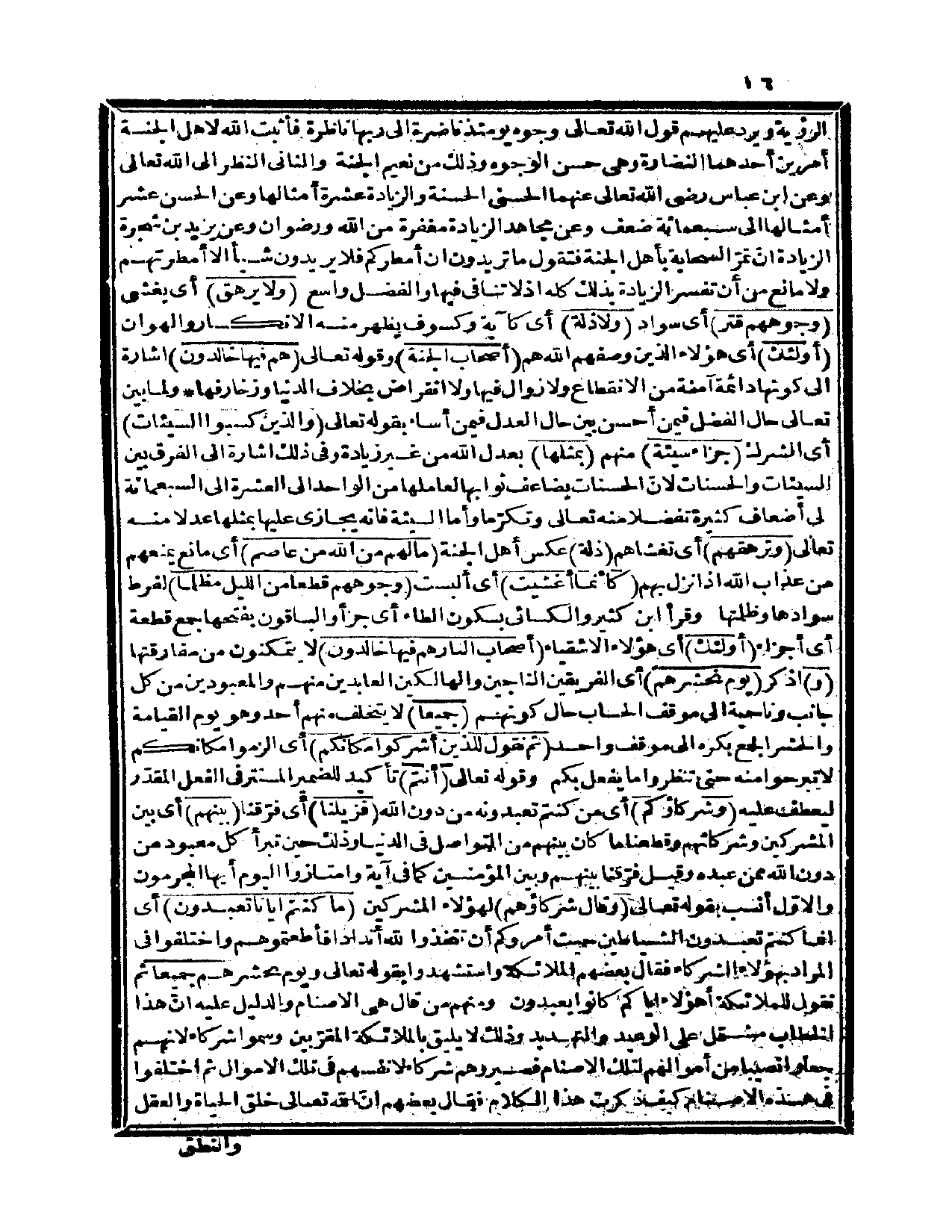 الرؤية، ويُردّ عليهم قول الله تعالى: {وجوه يومئذ ناضرة إلى ربها ناظرة} (القيامة، 22، 23) فأثبت الله لأهل الجنة أمرين أحدهما: النضارة وهي حسن الوجوه، وذلك من نعيم الجنة. والثاني: النظر إلى الله تعالى. وعن ابن عباس رضي الله تعالى عنهما: الحسنى الحسنة، والزيادة عشرة أمثالها. وعن الحسن عشر أمثالها إلى سبعمائة ضعف. وعن مجاهد: الزيادة مغفرة من الله ورضوان. وعن يزيد بن شجرة: الزيادة أن تمرّ السحابة بأهل الجنة فتقول: ما تريدون أن أمطركم، فلا يريدون شيئاً إلا أمطرتهم، ولا مانع من أن تفسر الزيادة بذلك كله؛ إذ لا تنافي فيها والفضل واسع. {ولا يرهق} أي: يغشى {وجوههم قتر} أي: سواد {ولا ذلة} أي: كآبة وكسوف يظهر منه الانكسار والهوان. {أولئك} أي: هؤلاء الذين وصفهم الله هم {أصحاب الجنة} وقوله تعالى: {هم فيها خالدون} إشارة إلى كونها دائمة آمنة من الانقطاع ولا زوال فيها ولا انقراض، بخلاف الدنيا وزخارفها. ولما بين تعالى حال الفضل فيمن أحسن بيّن حال العدل فيمن أساء بقوله تعالى: