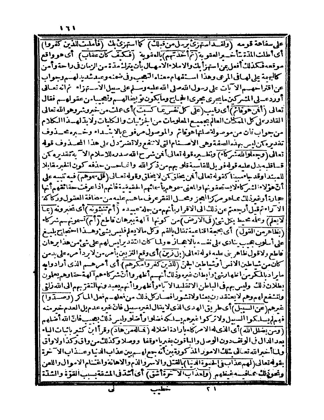 {ولقد استهزئ برسل من قبلك} كما استهزئ بك {فأمليت للذين كفروا، أي: أطلت المدّة بتأخير العقوبة ثم أخذتهم} بالعقوبة {فكيف كان عقاب} ، أي: هو واقع موقعه، فكذلك أفعل بمن استهزأ بك، والإملاء الإمهال بأن يترك مدّة من الزمان في راحة وأمن كالبهيمة يملي لها في المرعى، وهذا استفهام معناه التعجب، وفي ضمنه وعيد شديد لهم، وجواب عن اقتراحهم الآيات على رسول الله صلى الله عليه وسلم على سبيل الاستهزاء، ثم إنه تعالى أورد على المشركين ما يجري مجرى الحجاج، وما يكون توبيخاً لهم وتعجيباً من عقولهم فقال تعالى: