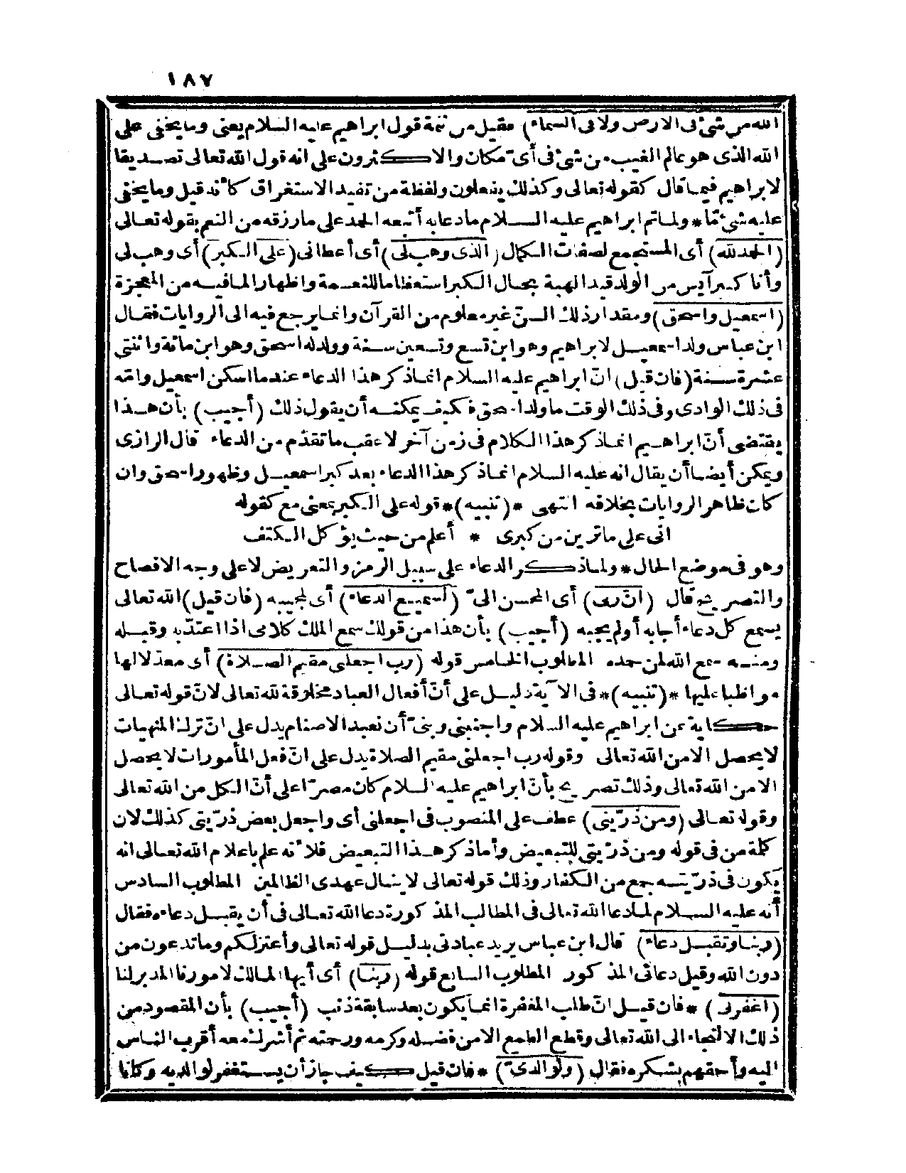 يدل على أنّ ترك المنهيات لا يحصل إلا من الله تعالى. وقوله: {رب اجعلني مقيم الصلاة} يدل على أنّ فعل المأمورات لا يحصل إلا من الله تعالى، وذلك تصريح بأنّ إبراهيم عليه السلام كان مصراً على أنّ الكل من الله تعالى، وقوله تعالى: {ومن ذرّيتي} عطف على المنصوب في اجعلني، أي: واجعل بعض ذريتي كذلك؛ لأن كلمة من في قوله (ومن ذرّيتي) للتبعيض، وأما ذكر هذا التبعيض، فلأنه علم بإعلام الله تعالى أنه يكون في ذرّيته جمع من الكفار وذلك قوله تعالى: {ولا ينال عهدي الظالمين} (البقرة، 124)