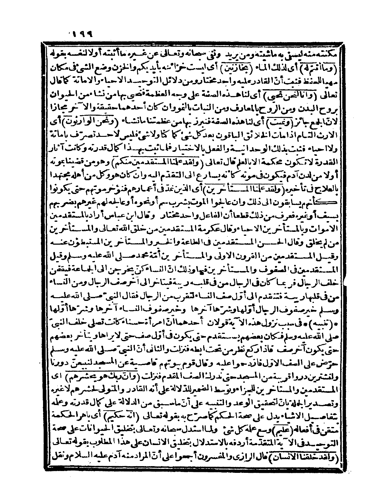 {ولقد علمنا المستقدمين منكم} وهو من قضينا بموته أولاً من لدن آدم فيكون في موته كأنه يسارع إلى التقدّم إليه وإن كان هو وكل من أهله مجتهداً بالعلاج في تأخيره {ولقد علمنا المستأخرين} ، أي: الذين نمدّ في أعمارهم فنؤخر موتهم حتى يكونوا كأنهم يسابقون إلى ذلك وإن عالجوا الموت بشرب سم أو نحوه أو عالجه لهم غيرهم بضربهم بسيف أو غيره فعرف من ذلك قطعاً أن الفاعل واحد مختار. وقال ابن عباس: أراد بالمستقدمين الأموات وبالمستأخرين الأحياءز وقال عكرمة: المستقدمين من خلق الله تعالى والمستأخرين من لم يخلق. وقال الحسن: المستقدمين في الطاعة والخير والمستأخرين المستبطؤون عنه. وقيل: المستقدمين من القرون الأولى والمستأخرين أمّة محمد صلى الله عليه وسلم وقيل: المستقدمين في الصفوف والمستأخرين فيها وذلك أنّ النساء كنّ يخرجن إلى الجماعة فيقفن خلف الرجال فربما كان في الرجال من في قلبه ريبة فيتأخر إلى آخر صف الرجال ومن النساء من في قلبها ريبة فتتقدم إلى أوّل صف النساء لتقرب من الرجال فقال النبيّ صلى الله عليه وسلم «خير صفوف الرجال أوّلها وشرّها آخرها، وخير صفوف النساء آخرها وشرّها أولها» . تنبيه: في سبب نزول هذه الآية قولان أحدهما: أنّ امرأة حسناء كانت تصلي خلف النبيّ صلى الله عليه وسلم فكان بعضهم يستقدم حتى يكون في أوّل صف حتى لا يراها ويتأخر بعضهم حتى يكون آخر صف، فإذا ركع نظر من تحت إبطه فنزلت. والثاني: أنّ النبيّ صلى الله عليه وسلم حرّض على الصف الأوّل فازدحموا عليه، وقال قوم بيوتهم قاصية عن المسجد لنبيعنّ دورنا ولنشترين دوراً قريبة من المسجد حتى ندرك الصف المقدم فنزلت.