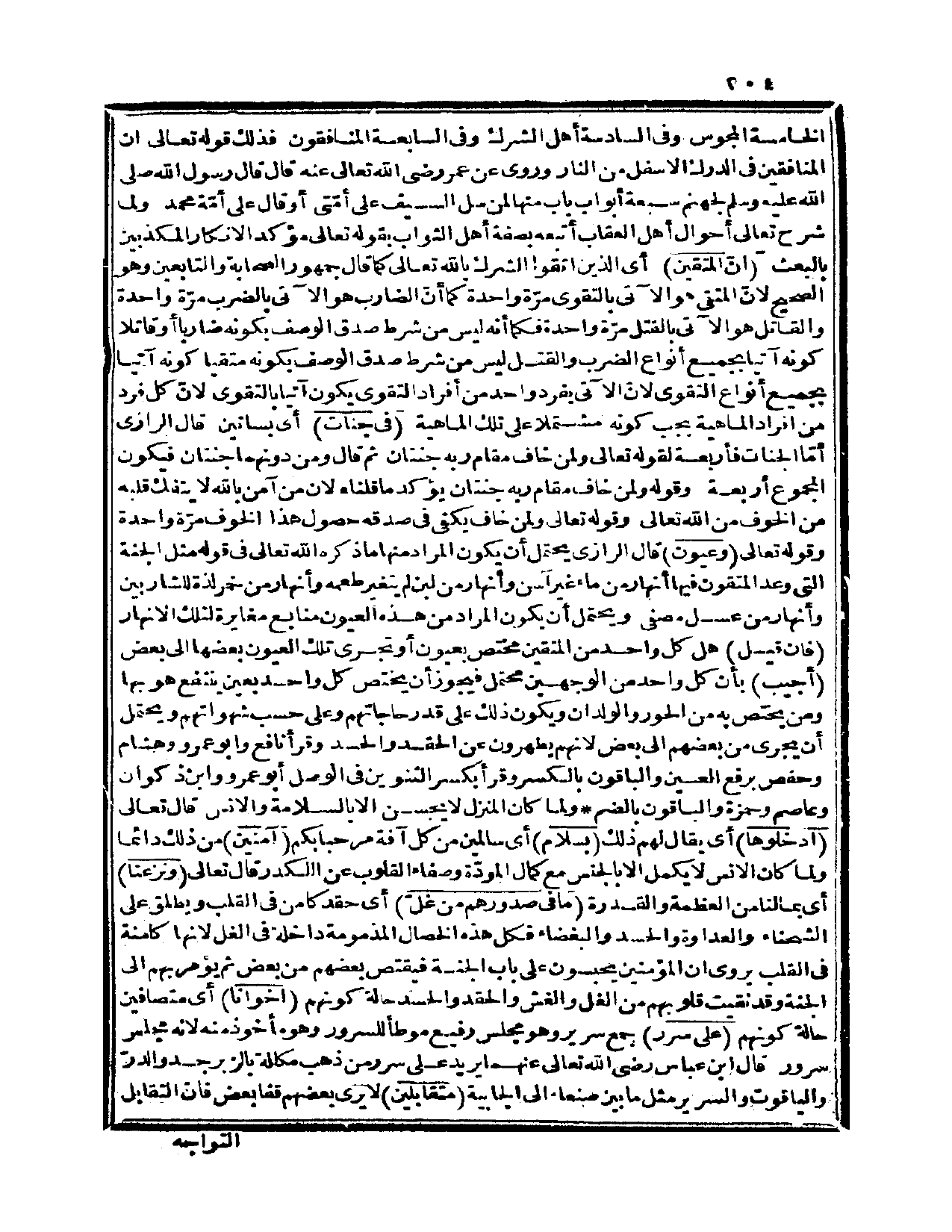 يؤكد ما قلناه لأن من آمن بالله لا ينفك قلبه من الخوف من الله تعالى. وقوله تعالى: {ولمن خاف} يكفي في صدقه حصول هذا الخوف مرّة واحدة. وقوله تعالى: {وعيون} قال الرازي: يحتمل أن يكون المراد منها ما ذكره الله تعالى في قوله {مثل الجنة التي وعد المتقون فيها أنهار من ماء غير آسن وأنهار من لبن لم يتغير طعمه وأنهار من خمرة لذة للشاربين وأنهار من عسل مصفى} (محمد، 15)