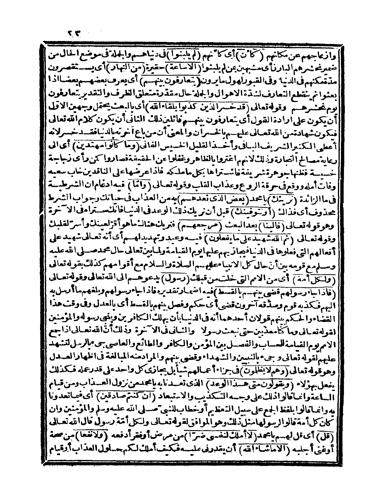 وإزعاجهم عن مكانهم {كأن} أي: كأنهم {لم يلبثوا} في دنياهم. والجملة في موضع الحال من ضمير نحشرهم البارز، أي: مشبهين بمن لم يلبثوا {إلا ساعة} حقيرة {من النهار} أي: يستقصرون مدّة مكثهم في الدنيا وفي القبور لهول ما يرون {يتعارفون بينهم} أي: يعرف بعضهم بعضاً إذا بعثوا ثم ينقطع التعارف لشدّة الأهوال، والجملة حال مقدّرة متعلق الظرف، والتقدير: يتعارفون يوم نحشرهم. وقوله تعالى: {قد خسر الذين كذبوا بلقاء الله} أي: بالبعث. يحتمل وجهين: الأوّل: أن يكون على إرادة القول، أي: يتعارفون بينهم قائلين ذلك، الثاني: أن يكون كلام الله تعالى، فيكون شهادة من الله تعالى عليهم بالخسران. والمعنى: أن من باع آخرته بالدنيا فقد خسر؛ لأنه أعطى الكثير الشريف الباقي وأخذ القليل الخسيس الفاني {وما كانوا مهتدين} أي: إلى رعاية مصالح التجارة، وذلك لأنهم اغتروا بالظاهر وغفلوا عن الحقيقة، فصاروا كمن رأى زجاجة خسيسة فظنها جوهرة شريفة فاشتراها بكل ما ملكه فإذا عرضها على الناقدين خاب سعيه وفات أمله ووقع في حرقة الروع وعذاب القلب. وقوله تعالى: