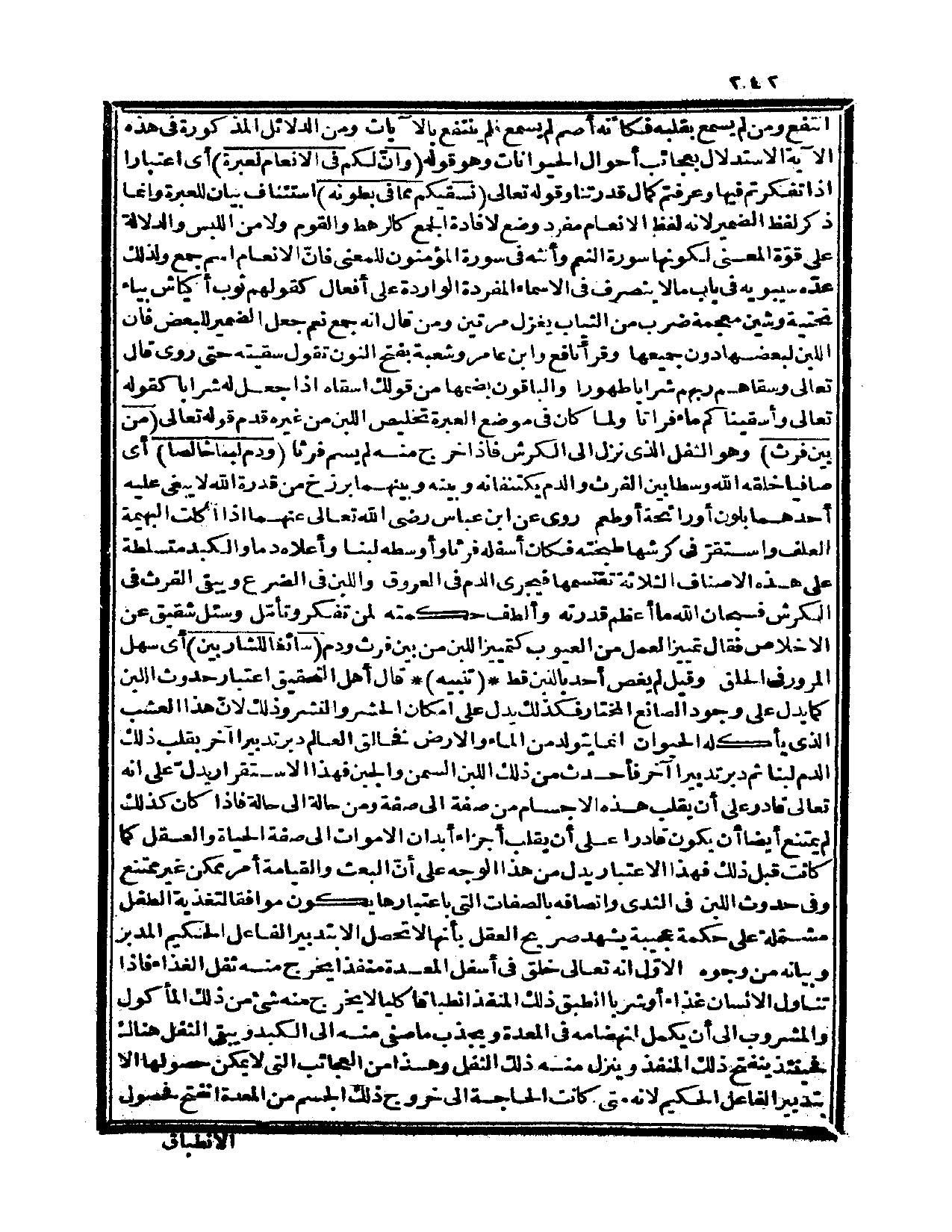 {وإنّ لكم في الأنعام لعبرة} أي: اعتباراً إذا تفكرتم فيها وعرفتم كمال قدرتنا وقوله تعالى: {نسقيكم مما في بطونه} استئناف بيان للعبرة وإنما ذكر لفظ الضمير لأنه لفظ الأنعام مفرد وضع لإفادة الجمع كالرهط والقوم ولا من اللبس والدلالة على قوّة المعنى لكونها سورة النعم وأنثه في سورة المؤمنون للمعنى فإنّ الأنعام اسم جمع ولذلك عدّه سيبويه في باب ما لا ينصرف في الأسماء المفردة الواردة على أفعال كقولهم: ثوب أكياش بياء تحتية وشين معجمة ضرب من الثياب يغزل مرتين ومن قال إنه جمع نعم جعل الضمير للبعض فإنّ اللبن لبعضها دون جميعها. وقرأ نافع وابن عامر وشعبة بفتح النون تقول: سقيته حتى روي. قال تعالى: {وسقاهم ربهم شراباً طهوراً} (الإنسان، 21)
