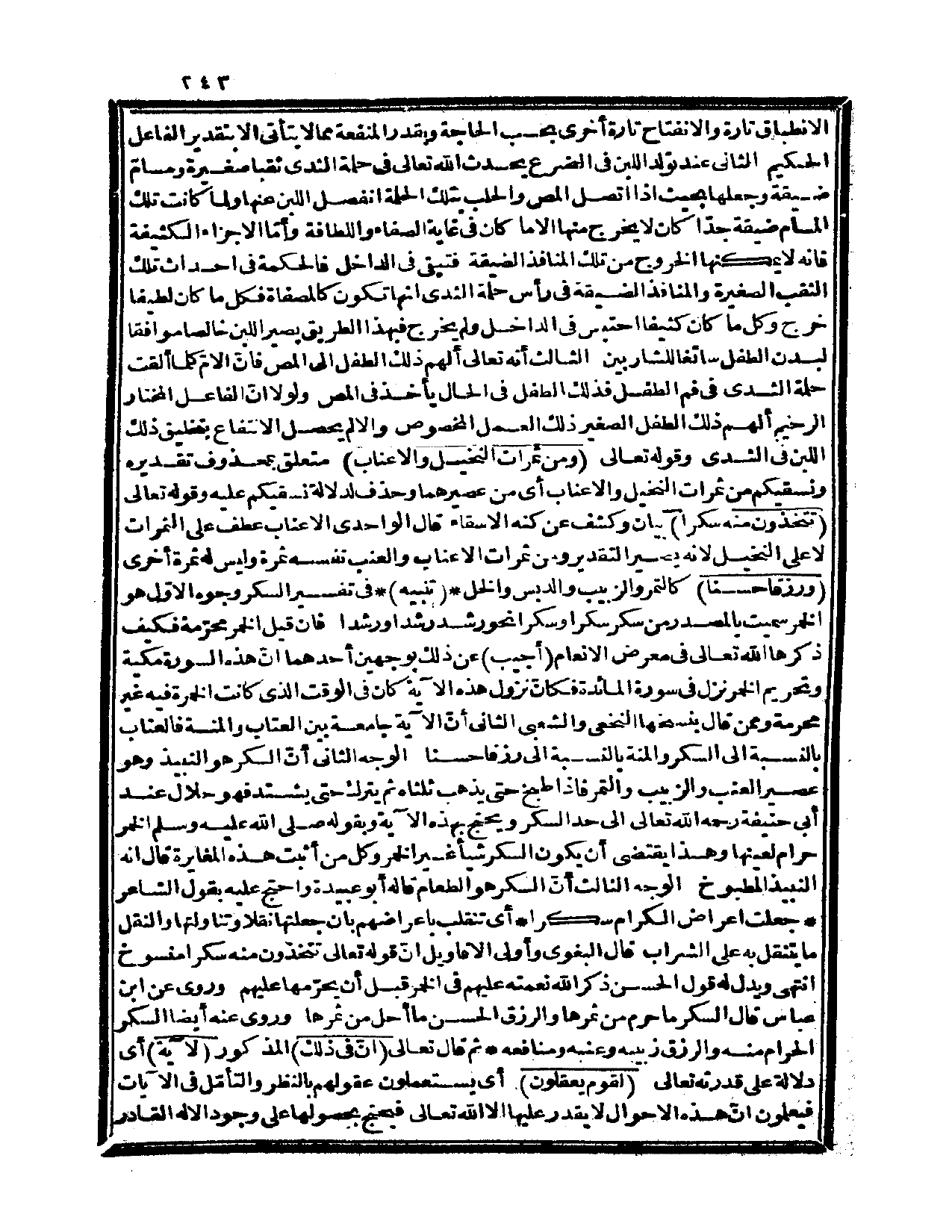 وقوله تعالى: {ومن ثمرات النخيل والأعناب} متعلق بمحذوف تقديره: ونسقيكم من ثمرات النخيل والأعناب، أي: من عصيرهما وحذف لدلالة نسقيكم عليه، وقوله تعالى: {تتخذون منه سكراً} بيان وكشف عن كنه الإسقاء. قال الواحدي: الأعناب عطف على الثمرات لا على النخيل لأنه يصير التقدير: ومن ثمرات الأعناب والعنب نفسه ثمرة وليس له ثمرة أخرى {ورزقاً حسناً} كالتمر والزبيب والدبس والخل. تنبيه: في تفسير السكر وجوه: الأوّل: هو الخمر سميت بالمصدر من سكر سكراً وسكراً نحو: رشد رشداً ورشداً. فإن قيل: الخمر محرمة فكيف ذكرها الله تعالى في معرض الأنعام؟ أجيب: عن ذلك بوجهين: أحدهما: أنّ هذه السورة مكية وتحريم الخمر نزل في سورة المائدة، فكأنّ نزول هذه الآية كان في الوقت الذي كانت الخمرة فيه غير محرمة وممن قال بنسخها النخعي والشعبي. الثاني: أنّ الآية جامعة بين العتاب والمنة فالعتاب بالنسبة إلى السكر والمنة بالنسبة إلى رزقاً حسناً. الوجه الثاني: أنّ السكر هو النبيذ وهو عصير العنب والزبيب والتمر فإذا طبخ حتى يذهب ثلثاه، ثم يترك حتى يشتد فهو حلال عند أبي حنيفة رحمه الله تعالى إلى حد السكر، ويحتج بهذه الآية وبقوله صلى الله عليه وسلم «الخمر حرام لعينها» وهذا يقتضي أن يكون السكر شيئاً غير الخمر وكل من أثبت هذه المغايرة قال: إنه النبيذ المطبوخ. الوجه الثالث: أنّ السكر هو الطعام قاله أبو عبيدة واحتج عليه بقول الشاعر: