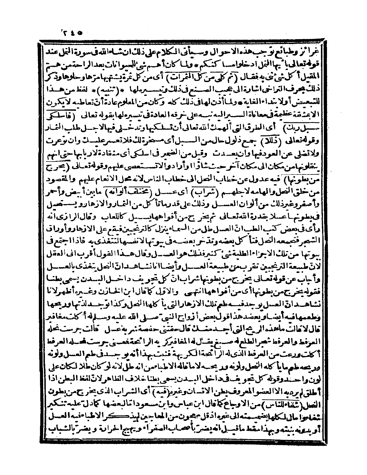 {ثم كلي من كل الثمرات} أي: من كل ثمرة يشتهيها مرّها وحلوها، وذكر ذلك بحرف التراخي إشارة إلى عجيب الصنع في ذلك وتيسيره لها. تنبيه: لفظ من هذا للتبعيض أو لابتداء الغاية. ولما أذن لها في ذلك كله، وكان من المعلوم عادة أنّ تعاطيه لا يكون إلا بمشقة عظيمة في معاناة السير إليه نبه على خرقه العادة في تيسيره لها بقوله تعالى: {فاسلكي سبل ربك} أي: الطرق التي ألهمك الله تعالى أن تسلكيها وتدخلي فيها لأجل طلب الثمار وقوله تعالى: {ذللاً} جمع ذلول حال من السبل، أي: مسخرة لك فلا تعسر عليك وإن توعرت ولا تضلي عن العود وإن بعدت. وقيل: من الضمير في اسلكي، أي: منقادة لأربابها حتى أنهم ينقلونها من مكان إلى مكان آخر حيث شاؤوا وأرادوا لا تستعصي عليهم. وقوله تعالى: {يخرج من بطونها} فيه عدول عن خطاب النحل إلى خطاب الناس لأنه محل الإنعام عليهم والمقصود من خلق النحل وإلهامه لأجلهم {شراب} أي: عسل {مختلف ألوانه} ما بين أبيض وأحمر وأصفر وغير ذلك من ألوان العسل وذلك على قدر ما تأكل من الثمار والأزهار ويستحيل في بطونها عسلاً بقدرة الله تعالى، ثم يخرج من أفواهها يسيل كاللعاب. وقال الرازي: إنه رأى في بعض كتب الطب أنّ العسل طل من السماء ينزل كالترنجبين فيقع على الأزهار وأوراق الشجر فتجمعه النحل فتأكل بعضه وتدّخر بعضه في بيوتها لأنفسها لتتغذى به فإذا اجتمع في بيوتها من تلك الأجزاء الطلية شيء كثير فذلك هو العسل وقال هذا القول أقرب إلى العقل لأنّ طبيعة الترنجبين تقرب من طبيعة العسل وأيضاً إنا نشاهد أنّ النحل يتغذى بالعسل وأجاب، عن قوله تعالى: {يخرج من بطونها شراب} إنّ كل تجويف داخل البدن يسمى بطناًفقوله: {يخرج من بطونها} أي: من أفواهها انتهى.