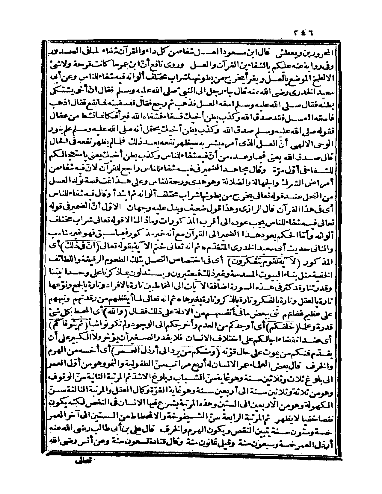 وعن أبي سعيد الخدري رضي الله عنه قال: «جاء رجل إلى النبيّ صلى الله عليه وسلم فقال: إنّ أخي يشتكي بطنه. فقال صلى الله عليه وسلم اسقه العسل فذهب ثم رجع فقال: قد سقيته فما نفع؟ فقال: اذهب فاسقه العسل فقد صدق الله وكذب بطن أخيك، فسقاه، فشفاه الله، فبرأ، فكأنما نشط من عقال» فقوله صلى الله عليه وسلم «صدق الله وكذب بطن أخيك» يحتمل أنه صلى الله عليه وسلم علم بنور الوحي الإلهي، أنّ العسل الذي أمره بشربه سيظهر نفعه بعد ذلك، فلما لم يظهر نفعه في الحال قال: صدق الله يعني فيما وعده من أنّ فيه شفاء للناس، وكذب بطن أخيك، يعني باستعجالكم للشفاء في أوّل مرّة. وقال مجاهد: الضمير في {فيه شفاء للناس} راجع للقرآن، لأنّ فيه شفاء من أمراض الشرك، والجهالة والضلالة. وهو هدى ورحمة للناس وعلى هذا تمت قصة تولد العسل من النحل عند قوله تعالى: {يخرج من بطونها شراب مختلف ألوانه} ثم ابتدأ وقال: {فيه شفاء للناس} أي: في هذا القرآن. قال الرازي: وهذا قول ضعيف، ويدل عليه وجهان: الأوّل أنّ الضمير في قوله تعالى: {فيه شفاء للناس} يجب عوده إلى أقرب المذكورات، وما ذاك إلا قوله تعالى: {شراب مختلف ألوانه} . وأمّا الحكم بعود هذا الضمير إلى القرآن مع أنه غير مذكور فيما سبق فهو غير مناسب. والثاني: حديث أبي سعيد الخدري المتقدّم. ثم إنه تعالى ختم الآية بقوله تعالى: {إنّ في ذلك} أي: المذكور {لآية لقوم يتفكرون} أي: في اختصاص النحل بتلك الطعوم الرقيقة واللطائف الخفية مثل بناء البيوت المسدسة وغير ذلك فيعتبرون ويستدلون بما ذكرنا على وحدانيتنا وقدرتنا وقد كثر في هذه السورة إضافة الآيات إلى المخاطبين تارة بالإفراد وتارة بالجمع، ونوّعها تارة بالعقل وتارة بالفكر وتارة بالذكر وتارة بغيرها. ثم إنه تعالى لما أيقظهم من رقدتهم ونبههم على عظيم غفلتهم ثنى ببعض ما في أنفسهم من الأدلة على ذلك فقال: