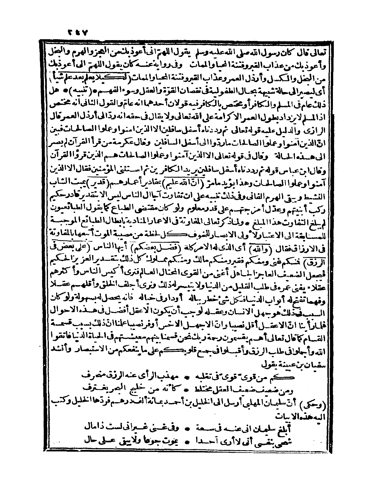 تعالى عنه قال: كان رسول الله صلى الله عليه وسلم يقول: «اللهمّ إني أعوذ بك من العجز والهرم والبخل، وأعوذ بك من عذاب القبر وفتنة المحيا والممات» . وفي رواية عنه كان يقول: «اللهمّ إني أعوذ بك من البخل والكسل وأرذل العمر وعذاب القبر وفتنة المحيا والممات» . {لكيلا يعلم بعد علم شيئاً} أي: ليصير إلى حالة شبيهة بحال الطفولية في نقصان القوّة والعقل وسوء الفهم. تنبيه: هل ذلك عام في المسلم والكافر أو مختص بالكافر فيه قولان: أحدهما: أنه عامّ، والقول الثاني: أنه مختص إذ المسلم لا يزداد بطول العمر إلا كرامة على الله تعالى، ولا يقال في حقه: إنه ردّ إلى أرذل العمر. قال الرازي: والدليل عليه قوله تعالى: {ثم رددناه أسفل سافلين إلا الذين آمنوا وعملوا الصالحات} (التين: 5، 6)