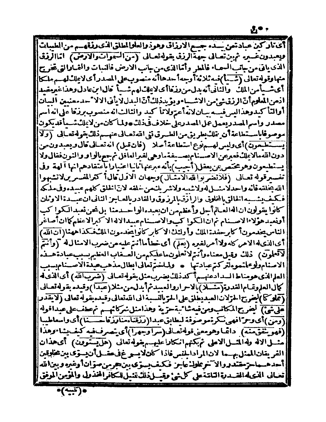 {ضرب الله} أي: الذي له كمال العلم وتمام القدرة. {مثلاً} بالأحرار والعبيد ثم أبدل من مثلاً {عبداً} وقيده بقوله تعالى: {مملوكاً} ليخرج الحرّ. لأنّ العبد يطلق على الحرّ بالنسبة إلى الله تعالى وقيده بقوله تعالى: {لا يقدر على شيء} ليخرج المكاتب ومن فيه شائبة حرّية وهذا مثل شركائهم ثم عطف على عبداً قوله: {ومن} أي: وحرًّا فهي نكرة موصوفة ليطابق عبداً {رزقناه منا رزقاً حسناً} أي: واسعاً طيباً {فهو ينفق منه} دائماً وهو معنى قوله تعالى: {سراً وجهراً} أي: يتصرف فيه كيف يشاء وهذا مثل الإله وله المثل الأعلى ثم بكتهم إنكاراً عليهم بقوله تعالى: {هل يستوون} أي: هذان الفريقان الممثل بهما لأن المراد الجنس فإذا كان لا يسوغ في عقل أن يسوّى بين مخلوقين أحدهما حرّ مقتدر والآخر مملوك عاجز، فكيف يسوّى بين حجر من صوّان أو غيره وبين الله تعالى الذي له القدرة التامّة على كل شيء، وقيل: ذلك تمثيل للكافر المخذول والمؤمن الموفق.