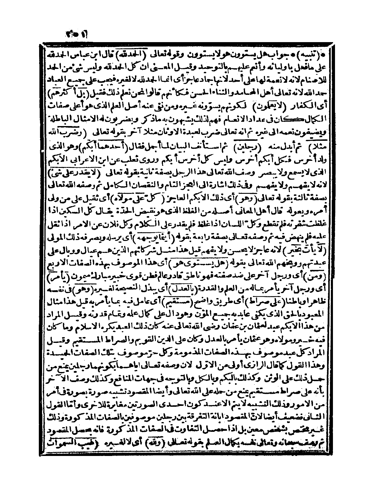 الوثن وكذلك بالبكم وبالكلّ وبالتوجه في جهات المنافع وكذلك وصف الآخر بأنه على صراط مستقيم يمنع من حمله على الله تعالى وأيضاً المقصود تشبيه صورة بصورة في أمر من الأمور وذلك التشبيه لا يتم إلا عند كون إحدى الصورتين مغايرة للأخرى، وأمّا القول الثاني فضعيف أيضاً لأنّ المقصود إبانة التفرقة بين رجلين موصوفين بالصفات المذكورة وذلك غير مختص بشخص معين بل إذا حصل التفاوت في الصفات المذكورة فإنه يحصل المقصود.