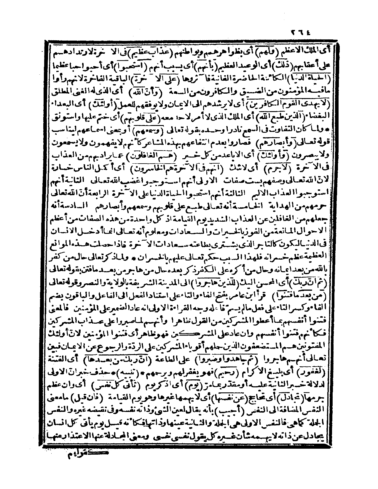 {لا جرم} أي: لا شك {أنهم في الآخرة هم الخاسرون} أي: أكمل الناس خسارة لأنّ الله تعالى وصفهم بست صفات الأولى: أنهم استوجبوا غضب الله تعالى. الثانية: أنهم استوجبوا العذاب الأليم. الثالثة: أنهم استحبوا الحياة الدنيا على الآخرة. الرابعة: أنّ الله تعالى حرمهم من الهداية. الخامسة: أنه تعالى طبع على قلوبهم وسمعهم وأبصارهم. السادسة: أنه جعلهم من الغافلين عن العذاب الشديد يوم القيامة إذ كل واحدة من هذه الصفات من أعظم الأحوال المانعة من الفوز بالخيرات والسعادات ومعلوم أنه تعالى إنما أدخل الإنسان في الدنيا ليكون كالتاجر الذي يشتري بطاعته سعادات الآخرة فإذا حصلت هذه الموانع العظيمة عظم خسرانه، فلهذا السبب حكم تعالى عليهم بالخسران. ولما ذكر تعالى حال من كفر بالله من بعد إيمانه، وحال من أكره على الكفر ذكر بعده حال من هاجر من بعد ما فتن بقوله تعالى: