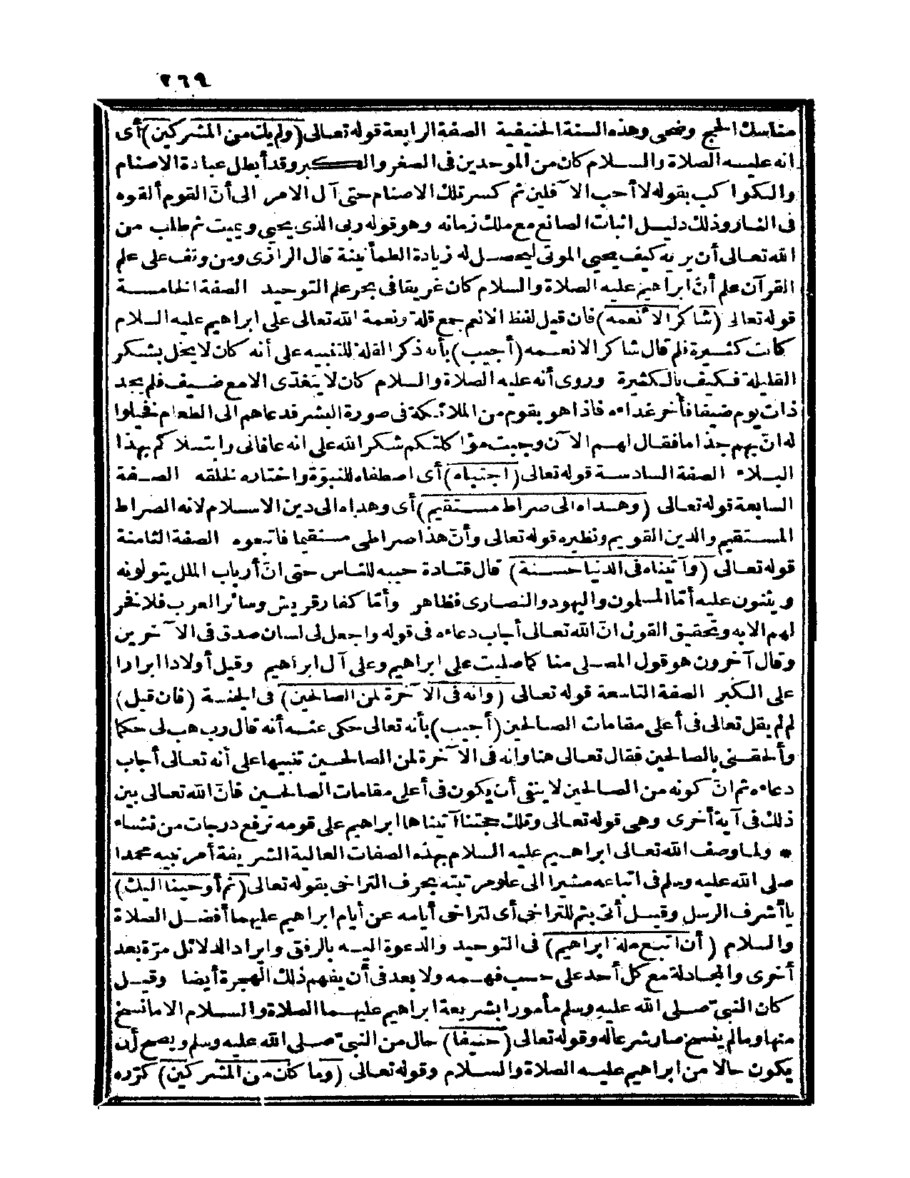 مناسك الحج، وضحى وهذه السنة الحنيفية. الصفة الرابعة: قوله تعالى: {ولم يك من المشركين} أي: أنه عليه الصلاة والسلام كان من الموحدين في الصغر والكبر، وقد أبطل عبادة الأصنام والكواكب بقوله: {لا أحب الآفلين} (الأنعام، 76)