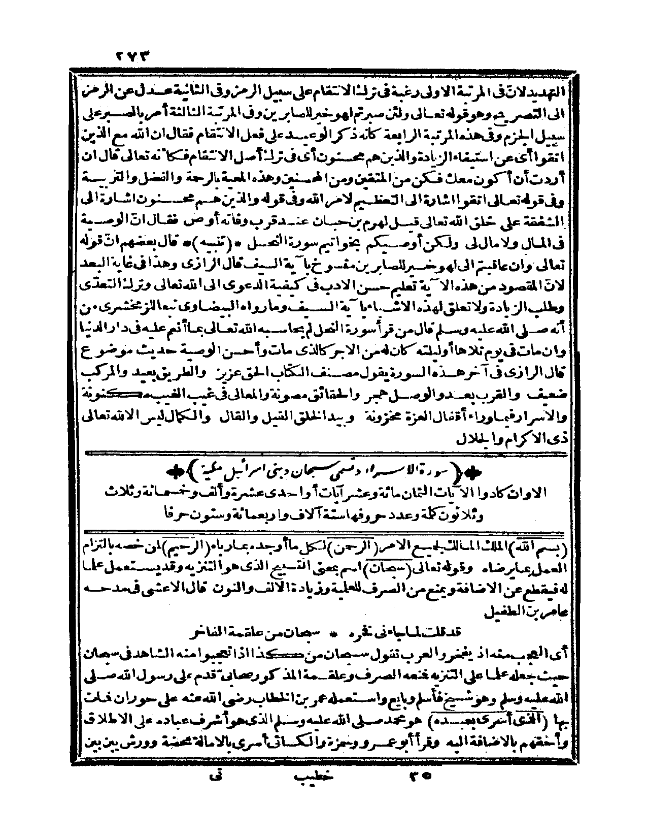 أي: العجب منه إذ يفخر والعرب تقول سبحان من كذا إذا تعجبوا منه الشاهد في سبحان حيث جعله علماً على التنزيه فمنعه الصرف وعلقمة المذكور صحابيّ قدم على رسول الله صلى الله عليه وسلم وهو شيخ فأسلم وبايع واستعمله عمر بن الخطاب رضي الله عنه على حوران فمات بها {الذي أسرى بعبده} هو محمد صلى الله عليه وسلم الذي هو أشرف عباده على الإطلاق وأحقهم بالإضافة إليه. وقرأ أبو عمرو وحمزة والكسائي أسرى بالإمالة محضة وورش بين بين