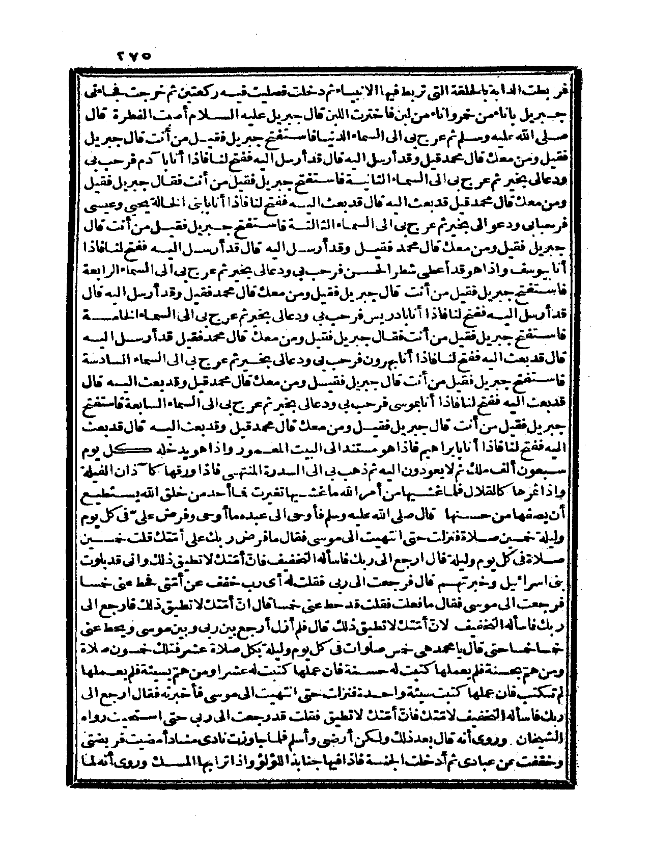 ففتح لنا فإذا أنا بيوسف وإذا هو قد أعطي شطر الحسن فرحب بي ودعا لي بخير. ثم عرج بي إلى السماء الرابعة فاستفتح جبريل فقيل: من أنت؟ قال: جبريل. فقيل: ومن معك؟ قال: محمد. فقيل: وقد أرسل إليه؟ قال: قد أرسل إليه. ففتح لنا فإذا أنا بإدريس فرحب بي ودعا لي بخير. ثم عرج بي إلى السماء الخامسة، فاستفتح جبريل فقيل: من أنت؟ فقال: جبريل. فقيل: من معك؟ قال: محمد. فقيل: قد أرسل إليه؟ قال: قد بعث إليه، ففتح لنا فإذا أنا بهارون فرحب بي ودعا لي بخير. ثم عرج بي إلى السماء السادسة فاستفتح جبريل فقيل: من أنت؟ قال: جبريل. فقيل: ومن معك؟ قال: محمد. قيل: وقد بعث إليه؟ قال: قد بعث إليه، ففتح لنا فإذا أنا بموسى فرحب بي ودعا لي بخير. ثم عرج بي إلى السماء السابعة فاستفتح جبريل فقيل: من أنت؟ قال: جبريل. فقيل: ومن معك؟ قال: محمد. قيل: وقد بعث إليه؟ قال: قد بعث إليه، ففتح لنا فإذا أنا بإبراهيم فإذا هو مستند إلى البيت المعمور وإذا هو يدخله كل يوم سبعون ألف ملك ثم لا يعودون إليه، ثم ذهب بي إلى السدرة المنتهى فإذا ورقها كآذان الفيلة وإذا ثمرها كالقلال فلما غشيها من أمر الله ما غشيها تغيرت فما أحد من خلق الله يستطيع أن يصفها من حسنها. قال صلى الله عليه وسلم فأوحى إلى عبده ما أوحى وفرض عليّ في كل يوم وليلة خمسين صلاة، فنزلت حتى انتهيت إلى موسى فقال: ما فرض ربك على أمّتك؟ قلت: خمسين صلاة في كل يوم وليلة. قال: ارجع إلى ربك فاسأله التخفيف، فإنّ أمّتك لا تطيق ذلك، وإني قد بلوت بني إسرائيل وخبرتهم. قال: فرجعت إلى ربي فقلت له: أي: رب خفف عن أمّتي فحط عني خمساً فرجعت إلى موسى فقال: ما فعلت؟ فقلت: قد حط عني خمساً. قال: إنّ أمّتك لا تطيق ذلك فارجع إلى ربك فاسأله التخفيف، لأنّ أمّتك لا تطيق ذلك. قال: فلم أزل أرجع بين ربي وبين موسى ويحط عني خمساً خمساً حتى قال: يا محمد، هي خمس صلوات في كل يوم وليلة بكل صلاة