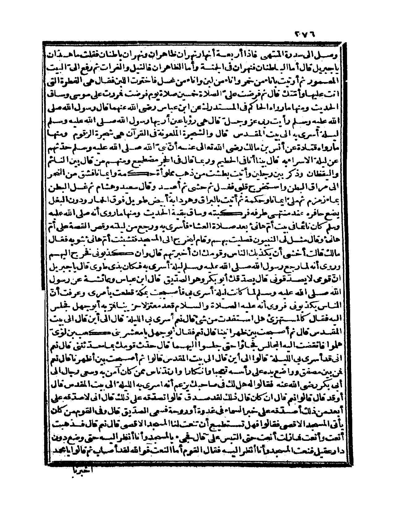 وصل إلى سدرة المنتهى فإذا أربعة أنهار نهران ظاهران ونهران باطنان فقلت: «ما هذان يا جبريل؟ قال: أما الباطنان فنهران في الجنة، وأما الظاهران فالنيل والفرات، ثم رفع إليّ البيت المعمور ثم أوتيت بإناء من خمر وإناء من لبن وإناء من عسل فاخترت اللبن فقال: هي الفطرة التي أنت عليها وأمّتك قال: ثم فرضت عليّ الصلاة خمسين صلاة يوم فرضت فمررت على موسى وساق الحديث» . ومنها ما رواه الحاكم في المستدرك عن ابن عباس رضي الله عنهما قال رسول الله صلى الله عليه وسلم «رأيت ربي عز وجل» . قال: هي رؤيا عين أريها رسول الله صلى الله عليه وسلم ليلة أسري به إلى بيت المقدس. قال: والشجرة الملعونة في القرآن هي شجرة الزقوم.