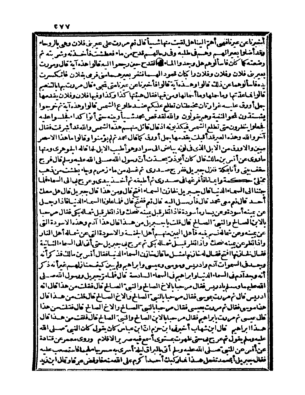 ومنها ما روي عن أنس بن مالك قال: كان أبو ذرّ يحدث أنّ رسول الله صلى الله عليه وسلم قال: «فرج سقف بيتي وأنا بمكة فنزل جبريل ففرج صدري ثم غسله من ماء زمزم، وجاء بطشت من ذهب ممتلئ حكمة وإيماناً فأفرغها في صدري ثم أطبقه، ثم أخذ بيدي وعرج بي إلى السماء فلما جئنا إلى السماء الدنيا قال جبريل لخازن السماء: افتح. قال: ومن هذا؟ قال جبريل. قال: هل معك أحد؟ قال: نعم معي محمد. قال: فأرسل إليه؟ قال: نعم ففتح، قال: فلما علونا السماء الدنيا فإذا رجل عن يمينه أسودة وعن يساره أسودة فإذا نظر قبل يمينه ضحك وإذا نظر قبل شماله بكى، فقال: مرحباً بالابن الصالح والنبيّ الصالح. قال: قلت: يا جبريل من هذا؟ قال: هذا آدم، وهذه الأسودة التي عن يمينه وعن شماله نسم بنيه فأهل اليمين منهم أهل الجنة، والأسودة التي عن شماله أهل النار وإذا نظر عن يمينه ضحك، وإذا نظر قبل شماله بكى، ثم عرج بي جبريل حتى أتى إلى السماء الثانية فقال لخازنها: افتح، فقال له خازنها: مثل ما قال خازن السماء الدنيا. فقال أنس بن مالك فذكر أنه وجد في السموات آدم وإدريس وموسى وعيسى وإبراهيم ولم يبين كيف منازلهم غير أنه ذكر أنه وجد آدم في السماء الدنيا وإبراهيم في السماء السادسة. قال: فلما مرّ جبريل ورسول الله صلى الله عليه وسلم بإدريس فقال: مرحباً بالأخ الصالح والنبيّ الصالح. قال: فقلت: من هذا؟ قال: إنه إدريس. قال: ثم مررت بموسى فقال: مرحباً بالنبيّ الصالح والأخ الصالح. قال: قلت: من هذا؟ قال: هذا موسى فقال: ثم مررت بعيسى فقال: مرحباً بالنبيّ الصالح والأخ الصالح. قال: فقلت من هذا؟ قال: عيسى، ثم مررت بإبراهيم فقال: مرحباً بالابن الصالح والنبيّ الصالح. قال: فقلت: من هذا؟ قال: هذا إبراهيم. قال ابن شهاب: أخبرني ابن حزم أنّ ابن عباس كان يقول كان النبيّ صلى الله عليه وسلم يقول: ثم عرج بي حتى ظهرت بمستوى أسمع فيه صرير الأقلام» .