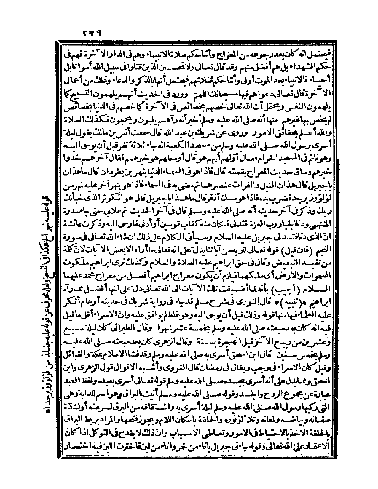 وروي عن شريك بن عبد الله قال: سمعت أنس بن مالك يقول: «ليلة أسري برسول الله صلى الله عليه وسلم من مسجد الكعبة أنه جاء ثلاثة نفر قبل أن يوحى إليه وهو نائم في المسجد الحرام فقال أوّلهم: أيهم هو. قال أوسطهم: هو خيرهم فقال آخرهم: خذوا خيرهم» وساق حديث المعراج بقصته. قال: «فإذا هو في السماء الدنيا بنهرين يطردان قال: ما هذان يا جبريل؟ قال: هذان النيل والفرات عنصرهما ثم مضى به في السماء فإذا هو بنهر آخر عليه نهر من لؤلؤ وزبرجد فضرب يده فإذا هو مسك أذفر. قال: ما هذا يا جبريل؟ قال: هو الكوثر الذي خبأ لك ربك» وذكر في آخر حديثه أنه صلى الله عليه وسلم قال في آخر الحديث: «ثم علا بي حتى جاء سدرة المنتهى ودنا الجبار ورب العزة فتدلى فكان منه كقاب قوسين أو أدنى فأوحى إليه» وذكرت عائشة أنّ الذي دنا فتدلى جبريل عليه السلام وسيأتي الكلام على ذلك إن شاء الله تعالى في سورة النجم.