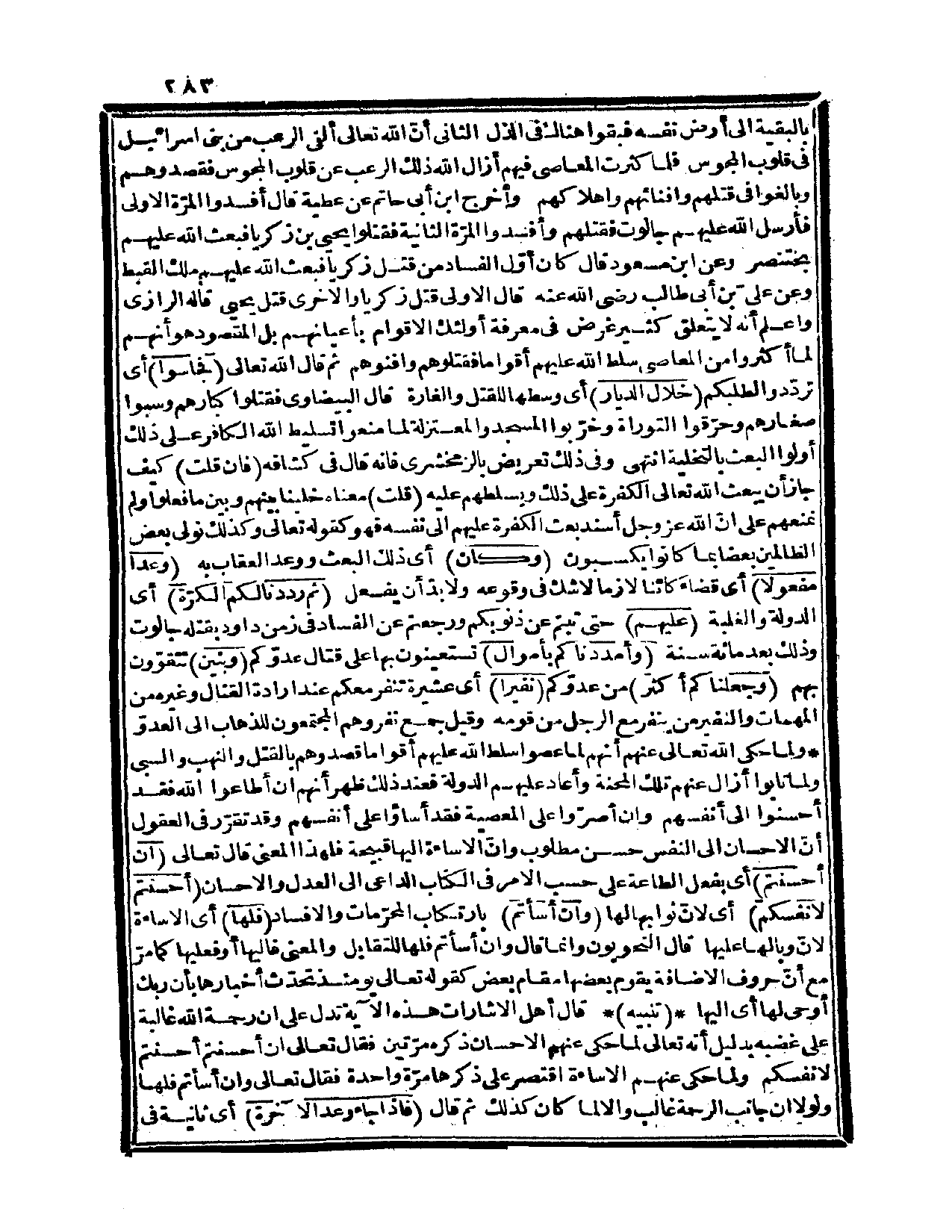 ثم قال الله تعالى: {فجاسوا} أي: تردّدوا لطلبكم {خلال الديار} أي: وسطها للقتل والغارة. قال البيضاوي: فقتلوا كبارهم وسبوا صغارهم وحرّقوا التوراة وخرّبوا المسجد، والمعتزلة لما منعوا تسليط الله الكافر على ذلك أولوا البعث بالتخلية انتهى. وفي ذلك تعريض بالزمخشري فإنه قال في «كشافه» : فإن قلت كيف جاز أن يبعث الله تعالى الكفرة على ذلك ويسلطهم عليه. قلت: معناه خلينا بينهم وبين ما فعلوا ولم نمنعهم على أنّ الله عز وجل أسند بعث الكفرة عليهم إلى نفسه فهو كقوله تعالى: {وكذلك نولي بعض الظالمين بعضاً بما كانوا يكسبون} (الأنعام، 129)