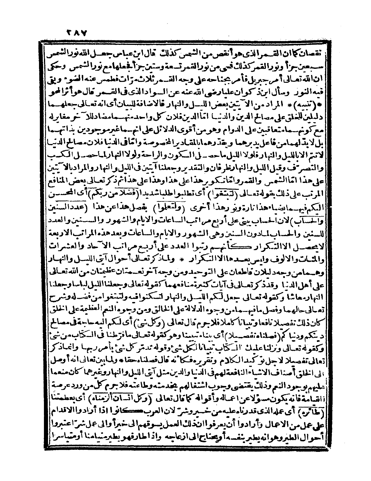 نقصان، كما أن القمر الذي هو أنقص من الشمس كذلك. قال ابن عباس: جعل الله نور الشمس سبعين جزءاً ونور القمر كذلك فمحى من نور القمر تسعة وستين جزءاً فجعلها مع نور الشمس. وحكي أن الله تعالى أمر جبريل فأمر بجناحه على وجه القمر ثلاث مرّات فطمس عنه الضوء وبقي فيه النور. وسأل ابن ذكوان علياً رضي الله عنه عن السواد الذي في القمر قال هو أثر المحو. تنبيه: المراد من الآيتين بعض الليل والنهار فالإضافة للبيان أي: أنه تعالى جعلهما دليلين للخلق على مصالح الدين والدنيا، أمّا الدين فلأن كل واحد منهما مضاد للآخر مغاير له مع كونهما متعاقبين على الدوام وهو من أقوى الدلائل على أنهما غير موجودين بذاتهما بل لا بدّ لهما من فاعل يدبرهما ويقدّرهما بالمقادير المخصوصة، وأمّا في الدنيا فلأن مصالح الدنيا لا تتم إلا بالليل والنهار فلولا الليل ما حصل السكون والراحة ولولا النهار لما حصل الكسب والتصرّف وقيل الليل والنهار ظرفان والتقدير وجعلنا آيتين في الليل والنهار والمراد بالآيتين على هذا إمّا الشمس والقمر وإمّا تكوير هذا على هذا وهذا على هذا ثم ذكر تعالى بعض المنافع المرتب على ذلك بقوله تعالى: {لتبتغوا}