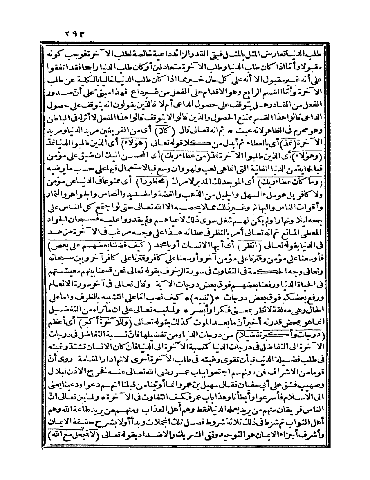. تنبيه: كيفَ: نصب إمّا على التشبيه بالظرف وإما على الحال وهي معلقة لانظر بمعنى فكر أو أبصر. ولما نبه تعالى على أن ما نراه من التفضيل إنما هو بمحض قدرته أخبر أنّ ما بعد الموت كذلك بقوله تعالى: {وللآخرة أكبر} أي: أعظم {درجاتٍ وأكبر تفضيلاً} من درجات الدنيا ومن تفضيلها فإنّ نسبة التفاضل في درجات الآخرة إلى التفاضل في درجات الدنيا كنسبة الآخرة إلى الدنيا فإن كان الإنسان تشتدّ رغبته في طلب فضيلة الدنيا فبأن تقوى رغبته في طلب الآخرة أحرى لأنها دار المقامة. روي أنّ قوماً من الأشراف فمن دونهم اجتمعوا بباب عمر رضي الله تعالى عنه فخرج الأذن لبلال وصهيب فشق على أبي سفيان فقال سهيل بن عمرو: إنما أوتينا من قبلنا أنهم دعوا ودعينا يعني إلى الإسلام فأسرعوا وأبطأنا وهذا باب عمر فكيف التفاوت في الآخرة. ولما بيّن تعالى أنّ الناس فريقان منهم من يريد بعمله الدنيا فقط وهم أهل العذاب ومنهم من يريد طاعة الله وهم أهل الثواب، ثم شرط في ذلك ثلاثة شروط فصل تلك المجملات وبدأ أولاً بشرح حقيقة الإيمان وأشرف أجزاء الإيمان هو التوحيد ونفي الشريك والأضداد بقوله تعالى: