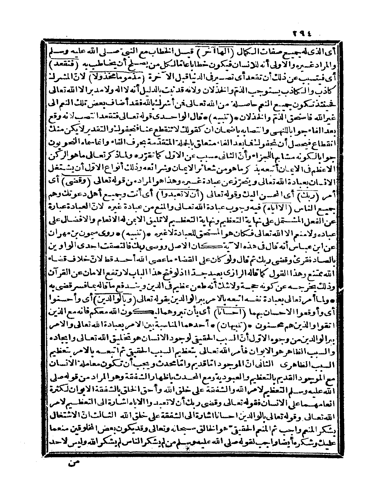 تنبيهان: أحدهما المناسبة بين الأمر بعبادة الله تعالى والأمر ببر الوالدين من وجوه الأوّل أن السبب الحقيقي لوجود الإنسان هو تخليق الله تعالى وإيجاده والسبب الظاهر هو الأبوان فأمر الله تعالى بتعظيم السبب الحقيقي ثم أتبعه بالأمر بتعظيم السبب الظاهري. الثاني: أنّ الموجود إمّا قديم وإمّا محدث ويجب أن تكون معاملة الإنسان مع الموجود القديم بالتعظيم والعبودية ومع المحدث بإظهار الشفقة وهو المراد من قوله صلى الله عليه وسلم «التعظيم لأمر الله والشفقة على خلق الله وأحق الخلق بالشفقة الأبوان لكثرة إنعامهما على الإنسان» فقوله تعالى: {وقضى ربك أن لا تعبدوا إلا إياه} إشارة إلى التعظيم لأمر الله تعالى. وقوله تعالى: {بالوالدين إحساناً} إشارة إلى الشفقة على خلق الله. الثالث: أنّ الاشتغال بشكر المنعم واجب ثم المنعم الحقيقي هو الخالق سبحانه وتعالى وقد يكون بعض المخلوقين منعماً عليك وشكره أيضاً واجب لقوله صلى الله عليه وسلم «من لم يشكر الناس لم يشكر الله» ، وليس لأحد