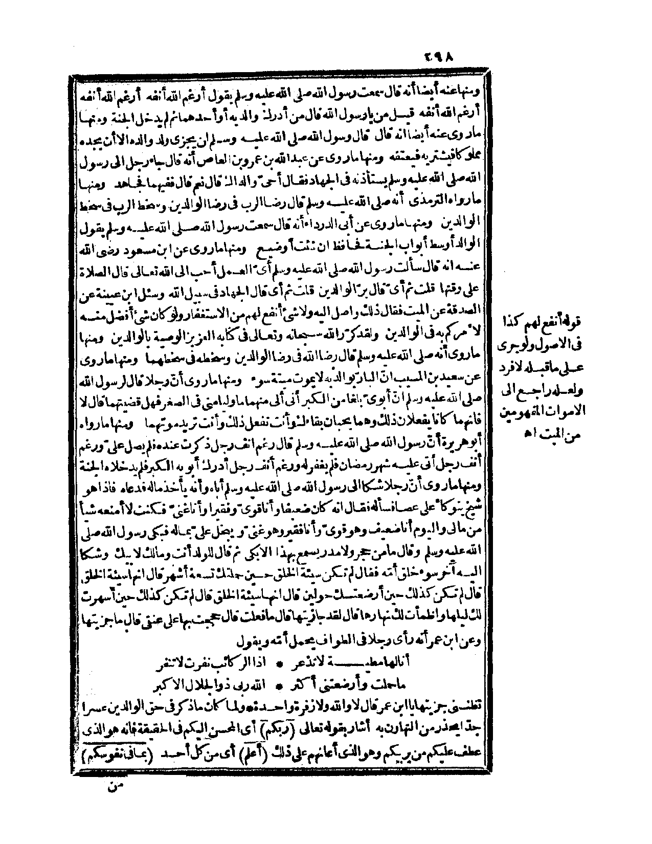 ومنها عنه أيضاً أنه قال: «سمعت رسول الله صلى الله عليه وسلم يقول: أرغم الله أنفه أرغم الله أنفه أرغم الله أنفه. قيل: من يا رسول الله؟ قال: من أدرك والديه أو أحدهما ثم لم يدخل الجنة» . ومنها ما روي عنه أيضاً أنه قال: «قال رسول الله صلى الله عليه وسلم لن يجزي ولد والده إلا أن يجده مملوكاً فيشتريه فيعتقه» . ومنها ما روي عن عبد الله بن عمرو بن العاص أنه قال: «جاء رجل إلى رسول الله صلى الله عليه وسلم يستأذنه في الجهاد. فقال: أحيّ والداك؟ قال: نعم. قال: ففيهما فجاهد» . ومنها ما رواه الترمذي أنه صلى الله عليه وسلم قال: «رضا الرب في رضا الوالدين، وسخط الرب في سخط الوالدين» . ومنها ما «روي عن أبي الدرداء أنه قال: سمعت رسول الله صلى الله عليه وسلم يقول: الوالد أوسط أبواب الجنة فحافظ إن شئت أو ضيِّع» . ومنها ما «روي عن ابن مسعود رضي الله عنه أنه قال: سألت رسول الله صلى الله عليه وسلم أي: العمل أحب إلى الله تعالى؟ قال: الصلاة على وقتها قلت: ثم أيّ؟ قال: برّ الوالدين. قلت: ثم أيّ؟ قال: الجهاد في سبيل الله» . وسئل ابن عيينة عن الصدقة عن الميت فقال: ذلك واصل إليه ولا شيء أنفع لهم من الاستغفار ولو كان شيء أفضل منه لأمركم به في الوالدين. ولقد كرّر الله سبحانه وتعالى في كتابه العزيز الوصية بالوالدين. ومنها ما روي أنه صلى الله عليه وسلم قال: «رضا الله في رضا الوالدين وسخطه في سخطهما» . ومنها ما روي عن سعيد بن المسيب أنّ البارّ بوالديه لا يموت ميتة سوء. ومنها ما «روي أنّ رجلاً قال لرسول الله صلى الله عليه وسلم إنّ أبويّ بلغا من الكبر أنى ألى منهما ما وليا مني في الصغر فهل قضيتهما قال: لا فإنهما