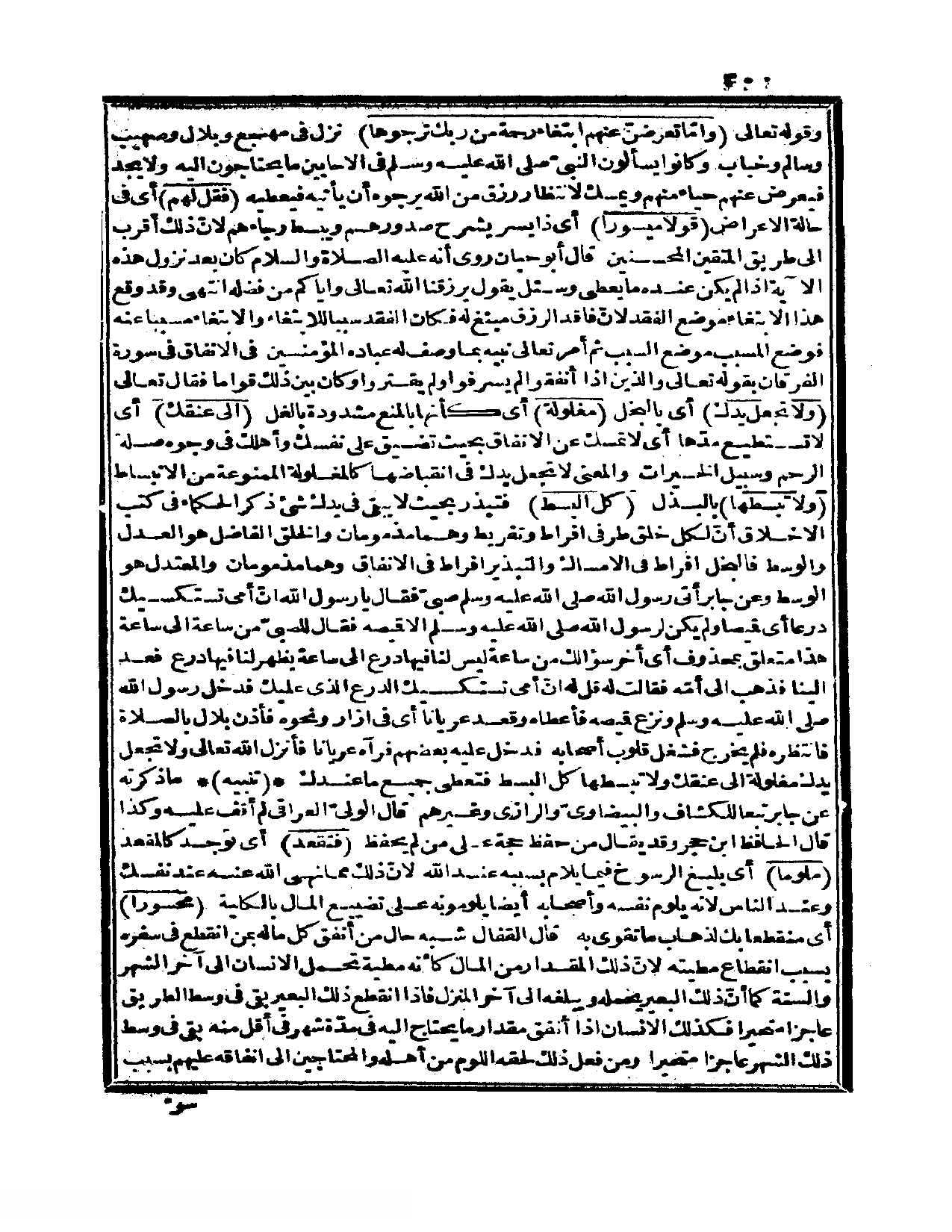 . فقال تعالى: {ولا تجعل يدك} أي: بالبخل {مغلولة} أي: كأنها بالمنع مشدودة بالغل {إلى عنقك} أي: لا تستطيع مدّها أي: لا تمسك عن الإنفاق بحيث تضيق على نفسك وأهلك في وجوه صلة الرحم وسبيل الخيرات، والمعنى لا تجعل يدك في انقباضها كالمغلولة الممنوعة من الانبساط {ولا تبسطها} بالبذل {كل البسط} فتبذر بحيث لا يبقى في يدك شيء. ذكر الحكماء في كتب الأخلاق أنّ لكل خلق طرفي إفراط وتفريط وهما مذمومان والخلق الفاضل هو العدل والوسط، فالبخل إفراط في الإمساك والتبذير إفراط في الإنفاق وهما مذمومان والمعتدل هو الوسط. وعن جابر أتى رسول الله صلى الله عليه وسلم صبيّ فقال: يا رسول الله إنّ أمي تستكسيك درعاً أي: قميصاً ولم يكن لرسول. الله صلى الله عليه وسلم إلا قميصه فقال للصبيّ: «من ساعة إلى ساعة» . هذا متعلق بمحذوف، أي: أخر سؤالك من ساعة ليس لنا فيها درع إلى ساعة يظهر لنا فيها درع فعد إلينا فذهب إلى أمّه فقالت له: قل له إنّ أمي تستكسيك الدرع الذي عليك فدخل رسول الله صلى الله عليه وسلم ونزع قميصه فأعطاه وقعد عرياناً أي: في إزار ونحوه فأذن بلال بالصلاة فانتظره فلم يخرج فشغل قلوب أصحابه فدخل عليه بعضهم فرآه عرياناً. فأنزل الله تعالى {ولا تجعل يدك مغلولة إلى عنقك ولا تبسطها كل البسط} » . فتعطي جميع ما عندك.