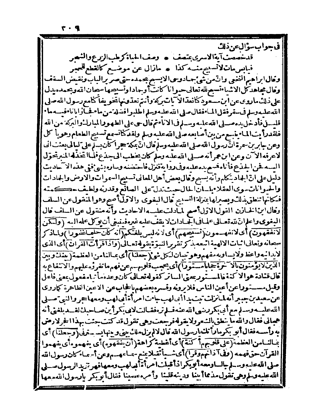 وقال إبراهيم النخعي: وإنّ من شيء جماد وحيّ إلا يسبح بحمده حتى صرير الباب ونقيض السقف، وقال مجاهد: كل الأشياء تسبح لله تعالى حيواناً كانت أو جماداً وتسبيحها سبحان الله وبحمده يدل على ذلك ماروي عن ابن مسعود كنا نعدّ الآيات بركة وأنتم تعدّونها تخويفاً كنا مع رسول الله صلى الله عليه وسلم في سفر فقلَّ الماء فقال صلى الله عليه وسلم «اطلبوا فضلة من ماء فجاؤوا بإناء فيه ماء قليل فأدخل يده صلى الله عليه وسلم في الإناء ثم قال: حي على الطهور المبارك والبركة من الله فلقد رأيت الماء ينبع من بين أصابعه صلى الله عليه وسلم ولقد كنا نسمع تسبيح الطعام وهو يأكل» . وعن جابر بن سمرة أنّ رسول الله صلى الله عليه وسلم قال: «إنّ بمكة حجراً كان يسلم عليّ ليالي بعثت إني لأعرفه الآن» . وعن ابن عمر أنه صلى الله عليه وسلم كان يخطب إلى جذع فلما اتخذ له المنبر تحوّل إليه فحن الجذع فأتاه فمسح يده عليه وفي رواية فنزل فاحتضنه وساره بشيء ففي هذه الأحاديث دليل على أنّ الجماد يتكلم وأنه يسبح.