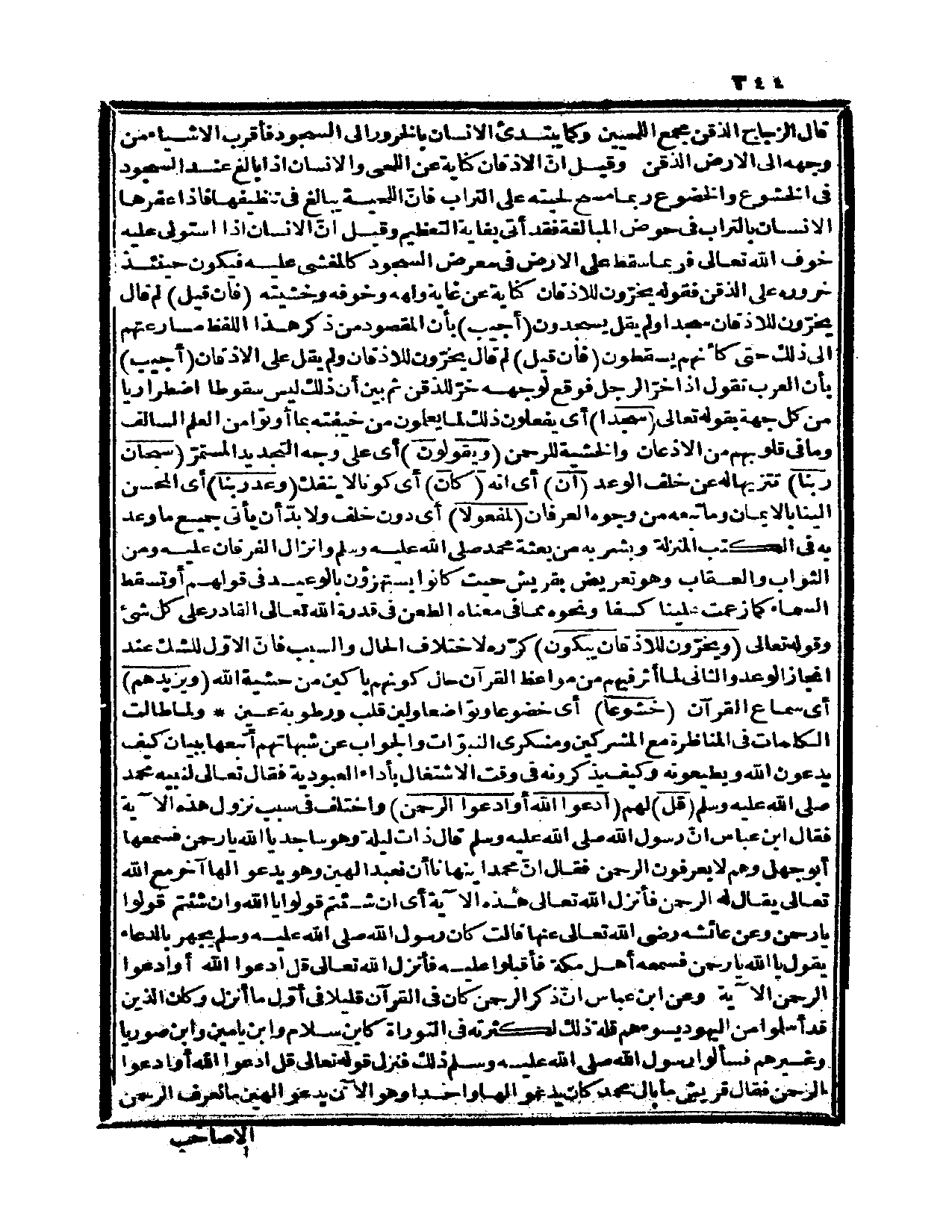 قال الزجاج: الذقن مجمع اللحيين وكما يبتدئ الإنسان بالخرور إلى السجود فأقرب الأشياء من وجهه إلى الأرض الذقن. وقيل: إنّ الأذقان كناية عن اللحى والإنسان إذا بالغ عند السجود في الخشوع والخضوع ربما مسح لحيته على التراب، فإنّ اللحية يبالغ في تنظيفها فإذا عفرها الإنسان بالتراب في حوض المبالغة فقد أتى بغاية التعظيم، وقيل: إنّ الإنسان إذا استولى عليه خوف الله تعالى فربما سقط على الأرض في معرض السجود كالمغشي عليه فيكون حينئذ خروره على الذقن فقوله {يخرّون للأذقان} كناية عن غاية ولهه وخوفه وخشيته. فإن قيل: لم قال: {يخرّون للأذقان سجداً} ولم يقل يسجدون؟ أجيب: بأنّ المقصود من ذكر هذا اللفظ مسارعتهم إلى ذلك حتى كأنهم يسقطون. فإن قيل: لم قال: {يخرّون للأذقان} ولم يقل على الأذقان؟ اجيب: بأن العرب تقول إذا خرّ الرجل فوقع لوجهه خرّ للذقن ثم بين أن ذلك ليس سقوطاً اضطرارياً من كل جهة بقوله تعالى: {سجداً} ، أي: يفعلون ذلك لما يعلمون من خيفته بما أوتوا من العلم السالف وما في قلوبهم من الإذعان والخشية للرحمن.