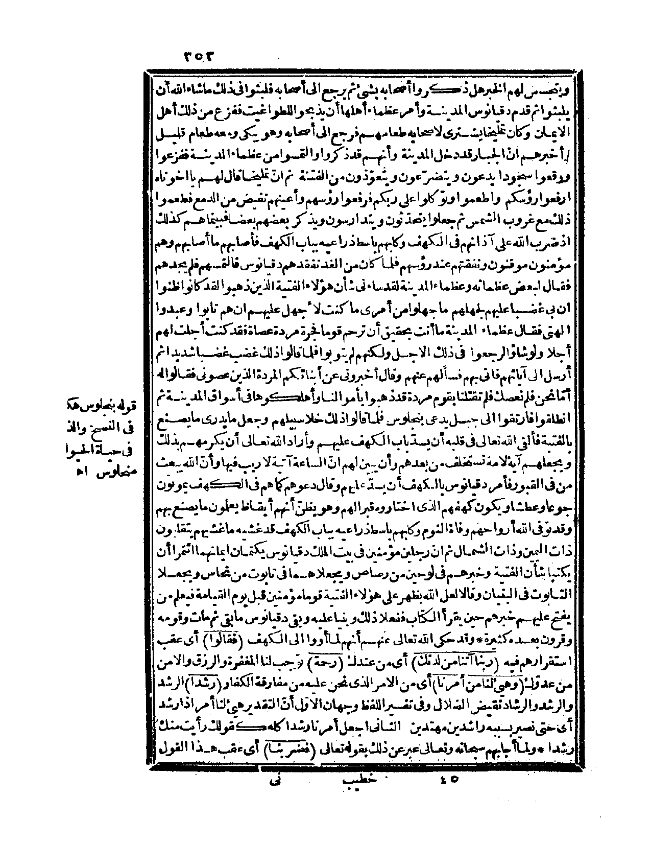 فقال عظماء المدينة: ما أنت بحقيق أن ترحم قوماً فجرة مردة عصاة، فقد كنت أجلت لهم أجلاً ولو شاؤوا لرجعوا في ذلك الأجل ولكنهم لم يتوبوا فلما قالوا ذلك غضب غضباً شديداً ثم أرسل إلى آبائهم فأتي بهم فسألهم وقال: أخبروني عن أبنائكم المردة الذين عصوني فقالوا له: أمّا نحن فلم نعصك فلم تقتلنا بقوم مردة قد ذهبوا بأموالنا وأهلكوها في أسواق المدينة ثم انطلقوا فارتقوا إلى جبل يدعى بنجلوس فلما قالوا ذلك خلا سبيلهم وجعل ما يدري ما يصنع بالفتية، فألقى الله تعالى في قلبه أن يسدّ باب الكهف عليهم واراد الله تعالى أن يكرمهم بذلك ويجعلهم آية لأمة تستخلف من بعدهم وأن يبين لهم {أنّ الساعة آتية لا ريب فيها وأنّ الله يبعث من في القبور} (الحج، 7) ، قوله بنجلوس هكذا في النسخ والذي في حياة الحيوان منحلوس اه. فأمر دقيانوس بالكهف أن يسدّ عليهم وقال: دعوهم كما هم في الكهف يموتون جوعاً وعطشاً ويكون كهفهم الذي اختاروه قبراً لهم وهو يظن أنهم أيقاظ يعلمون ما يصنع بهم، وقد توفى الله أرواحهم وفاة النوم وكلبهم باسط ذراعيه بباب الكهف قد غشيه ما غشيهم يتقلبون ذات اليمين وذات الشمال، ثم إنّ رجلين مؤمنين في بيت الملك دقيانوس يكتمان إيمانهما ائتمرا أن يكتبا شأن الفتية وخبرهم في لوحين من رصاص ويجعلاهما في تابوت من نحاس ويجعلا التابوت في البنيان وقالا: لعل الله يظهر على هؤلاء الفتية قوماً مؤمنين قبل يوم القيامة فيعلم من يفتح عليهم خبرهم حين يقرأ الكتاب ففعلا ذلك وبنيا عليه وبقي دقيانوس ما بقي ثم مات وقومه وقرون بعده كثيرة. وقد حكى الله تعالى عنهم أنهم لما أووا إلى الكهف {فقالوا} ، أي: عقب استقرارهم فيه {ربنا آتنا من لدنك} ، أي: من عندك {رحمة} توجب لنا المغفرة والرزق والأمن من عدوّك {وهيئ لنا من أمرنا} ، أي: من الأمر الذي نحن عليه من مفارقة الكفار {رشداً} الرشد والرشد والرشاد نقيض الضلال وفي تفسير اللفظ وجهان الأوّل أنّ