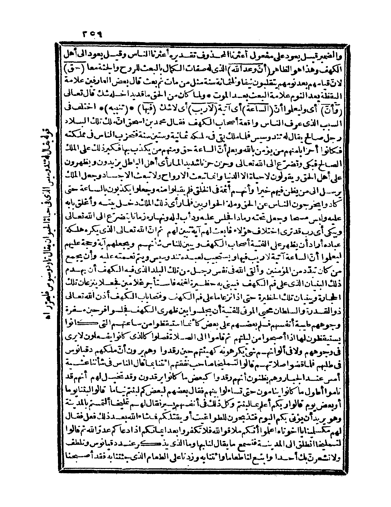 ثم إنّ الله تعالى الذي يكره هلكة عباده أراد أن يظهر على الفتية أصحاب الكهف ويبين للناس شأنهم ويجعلهم آية وحجة عليهم ليعلموا أنّ الساعة آتية لا ريب فيها، ويستجيب لعبده تندوسيس ويتم نعمته عليه، وأن يجمع من كان تبدّد من المؤمنين وألقى الله في نفس رجل من تلك البلد الذي فيه الكهف أن يهدم ذلك البنيان الذي على فم الكهف، فيبني به حظيرة لغنمه فاستأجر غلامين فجعلا ينزعان تلك الحجارة ويبنيان تلك الحظيرة حتى إذا نزعا ما على فم الكهف وفتحا باب الكهف أذن الله تعالى ذو القدرة والسلطان محيي الموتى للفتية أن يجلسوا بين ظهري الكهف فجلسوا فرحين مسفرة وجوههم طيبة أنفسهم فسلم بعضهم على بعض كأنما استيقظوا من ساعتهم التي كانوا يستيقظون لها إذا أصبحوا من ليلتهم ثم قاموا إلى الصلاة فصلوا كالذي كانوا يفعلون لا يرى في وجوههم ولا في ألوانهم شيء يكرهونه كهيئتم حين رقدوا وهم يرون أنّ ملكهم دقيانوس في طلبهم فلما قضوا صلاتهم قالوا لتمليخا صاحب نفقتهم ائتنا بما قال الناس في شأننا عشية أمس عند الجبار وهم يظنون أنهم رقدوا كبعض ما كانوا يرقدون وقد تخيل لهم أنهم قد ناموا أطول ما كانوا ينامون حتى تساءلوا بينهم فقال بعضهم لبعض كم لبثتم نياماً، قالوا لبثنا يوماً أو بعض يوم. قالوا ربكم أعلم بما لبثتم، وكل ذلك في أنفسهم يسير فقال لهم تمليخا: ألتمستم بالمدينة وهو يريد أن يؤتى بكم اليوم فتذبحون للطواغيت أو يقتلكم فما شاء الله بعد ذلك فعل فقال لهم مسكلمينا: يا إخواتاه اعلموا أنكم ملاقو الله فلا تكفروا بعد إيمانكم إذا دعاكم عدوّ الله ثم قالوا لتمليخا انطلق إلى المدينة فتسمع ما يقال لنا بها وما الذي يذكر عند دقيانوس وتلطف ولا تشعرنّ بك أحداً وابتع لنا طعاماً وائتنا به وزدنا على الطعام الذي جئتنا به فقد أصبحنا