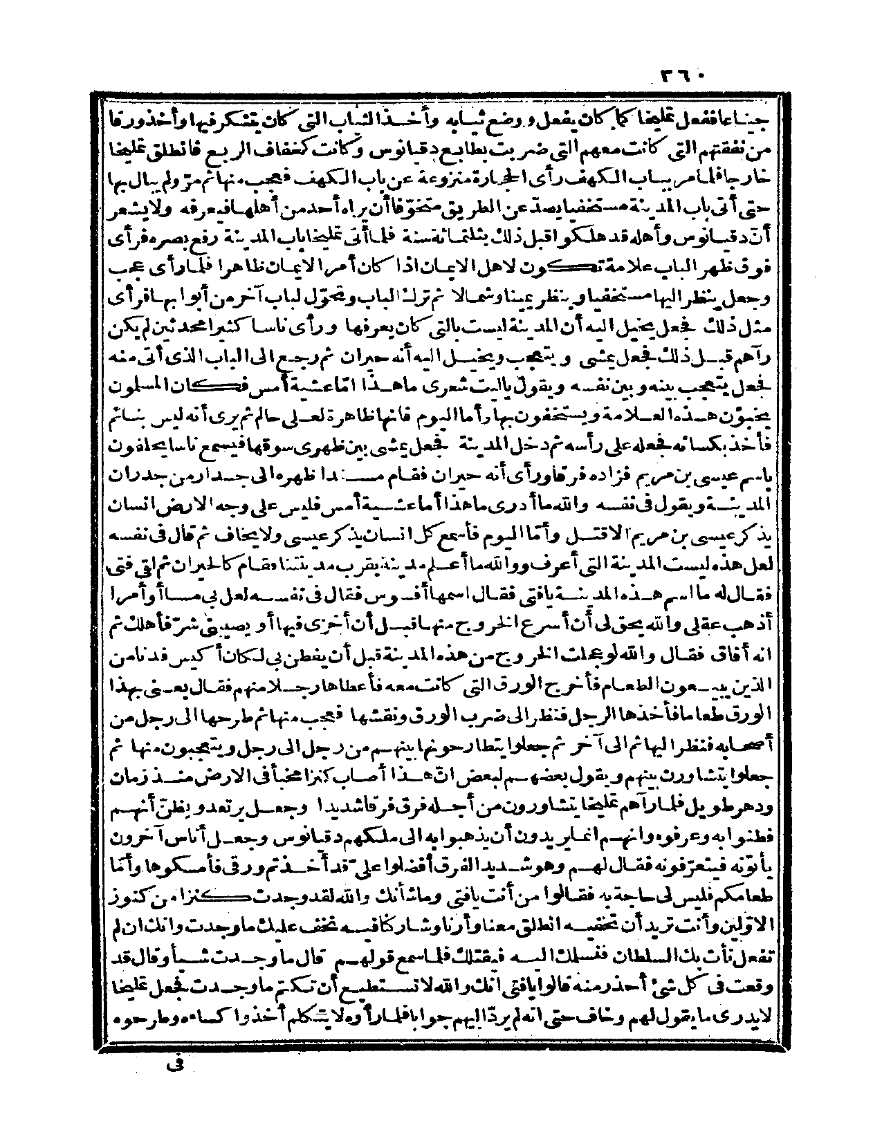 التي ضربت بطابع دقيانوس وكانت كخفاف الربع فانطلق تمليخا خارجاً فلما مر بباب الكهف رأى الحجارة منزوعة عن باب الكهف فعجب منها ثم مرّ ولم يبال بها حتى أتى باب المدينة مستخفياً يصدّ عن الطريق متخوّفاً أن يراه أحد من أهلها فيعرفه ولا يشعر أن دقيانوس وأهله قد هلكوا قبل ذلك بثلاثمئة سنة فلما أتى تمليخا باب المدينة رفع بصره فرأى فوق ظهر الباب علامة تكون لأهل الإيمان إذا كان أمر الإيمان ظاهراً فلما رأى عجب وجعل ينظر إليها مستخفياً وينظر يميناً وشمالاً ثم ترك الباب وتحوّل لباب آخر من أبوابها فرأى مثل ذلك، فجعل يخيل إليه أن المدينة ليست بالتي كان يعرفها ورأى ناساً كثيراً محدثين لم يكن رآهم قبل ذلك فجعل يمشي ويتعجب ويخيل إليه أنه حيران ثم رجع إلى الباب الذي أتى منه فجعل يتعجب بينه وبين نفسه، ويقول: