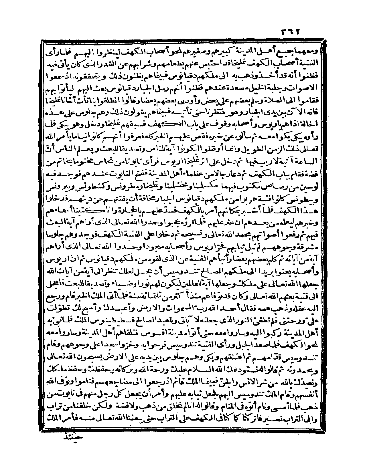 نستودعك الله السلام عليك ورحمة الله وبركاته وحفظك وحفظ ملكك ونعيذك بالله من شر الإنس والجنّ، فبينما الملك قائم إذ رجعوا إلى مضاجعهم فناموا وتوفى الله أنفسهم وقام الملك تندوسيس إليهم فجعل ثيابه عليهم، وأمر أن يجعل كل رجل منهم في تابوت من ذهب فلما أمسى ونام أتوه في المنام وقالوا له إنا لم نخلق من ذهب ولا فضة ولكن خلقنا من تراب وإلى التراب نصير فاتركنا كما كنا في الكهف على التراب حتى يبعثنا الله تعالى منه فأمر الملك