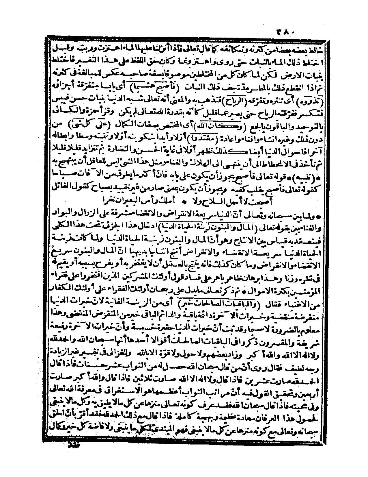 {المال والبنون زينة الحياة الدنيا} إدخال هذا الجزئيّ تحت هذا الكلي فينعقد به قياس بين الإنتاج وهو أن المال والبنون زينة الحياة الدنيا ولما كانت زينة الحياة الدنيا سريعة الانقضاء والانقراض أنتج إنتاجاً بديهياً أنّ المال والبنون سريع الانقضاء والانقراض وما كان كذلك فإنه ينتج بالعقل أن لا يفتخر به أو يفرح بسببه أو يقيم له في نظره وزناً وهذا برهان ظاهر باهر على فساد قول أولئك المشركين الذين افتخروا على فقراء المؤمنين بكثرة الأموال. ثم ذكر تعالى ما يدل على رجحان أولئك الفقراء على أولئك الكفار من الأغنياء فقال: {والباقيات الصالحات خير} ، أي: من الزينة الفانية لأنّ خيرات الدنيا منقرضة منقضية وخيرات الآخرة دائمة باقية والدائم الباقي خير من المنقرض المنقضي وهذا معلوم بالضرورة لا سيما وقد ثبت أنّ خيرات الدنيا حقيرة خسيسة وأنّ خيرات الآخرة رفيعة شريفة.