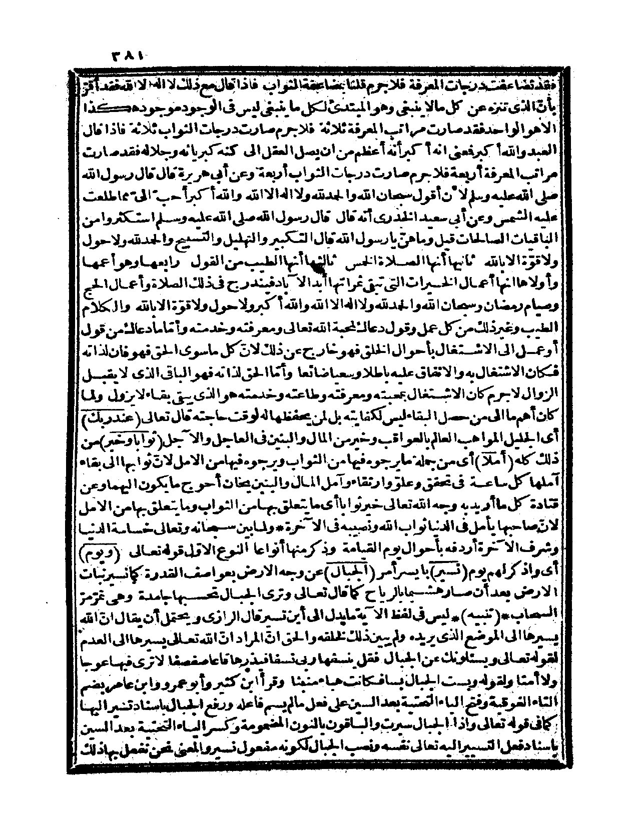 فقد تضاعفت درجات المعرفة فلا جرم قلنا بمضاعفة الثواب فإذا قال مع ذلك: لا إله إلا الله فقد أقر بأن الذي تنزه عن كل ما لا ينبغي وهو المبتدئ لكل ما ينبغي ليس في الوجود موجود هكذا إلا هو الواحد فقد صارت مراتب المعرفة ثلاثة فلا جرم صارت درجات الثواب ثلاثة فإذا قال العبد: والله أكبر فمعنى أنه أكبر أنه أعظم من أن يصل العقل إلى كنه كبريائه وجلاله فقد صارت مراتب المعرفة أربعة فلا جرم صارت درجات الثواب أربعة. وعن أبي هريرة قال: قال رسول الله صلى الله عليه وسلم «لأن أقول سبحان الله والحمد لله ولا إله إلا الله والله أكبر أحب إليّ مما طلعت عليه الشمس» . وعن أبي سعيد الخدري أنه قال: قال رسول الله صلى الله عليه وسلم «استكثروا من الباقيات الصالحات، قيل: وما هنّ يا رسول الله قال: التكبير والتهليل والتسبيح والحمد لله ولا حول ولا قوة إلا بالله» ، ثانيها أنها الصلاة الخمس، ثالثها أنها الطيب من القول، رابعها وهو أعمها، وأولاها أنها أعمال الخيرات التي تبقى ثمراتها أبد الآباد فيندرج في ذلك الصلاة وأعمال الحج وصيام رمضان وسبحان الله والحمد لله ولا إله إلا الله والله أكبر ولا حول ولا قوة إلا بالله والكلام الطيب وغير ذلك من كل عمل وقول دعاك لمحبة الله تعالى ومعرفته وخدمته، وأما ما دعاك من قول أو عمل إلى الاشتغال بأحوال الخلق فهو خارج عن ذلك لأن كل ما سوى الحق فهو فانٍ لذاته فكان الاشتغال به والانفاق عليه باطلاً وسعياً ضائعاً، وأما الحق لذاته فهو الباقي الذي لا يقبل الزوال، لا جرم كان الاشتغال بمحبته ومعرفته وطاعته وخدمته هو الذي يبقى بقاء لا يزول ولما كان أهم ما إلي من حصل البقاء ليس لكفايته بل لمن يحفظها له لوقت حاجته قال تعالى: {عند ربك} أي: الجليل المواهب العالم بالعواقب وخير من المال والبنين في العاجل والآجل {ثواباً وخير} من ذلك كله {أملاً} أي: من جملة ما يرجوه فيها من الثواب