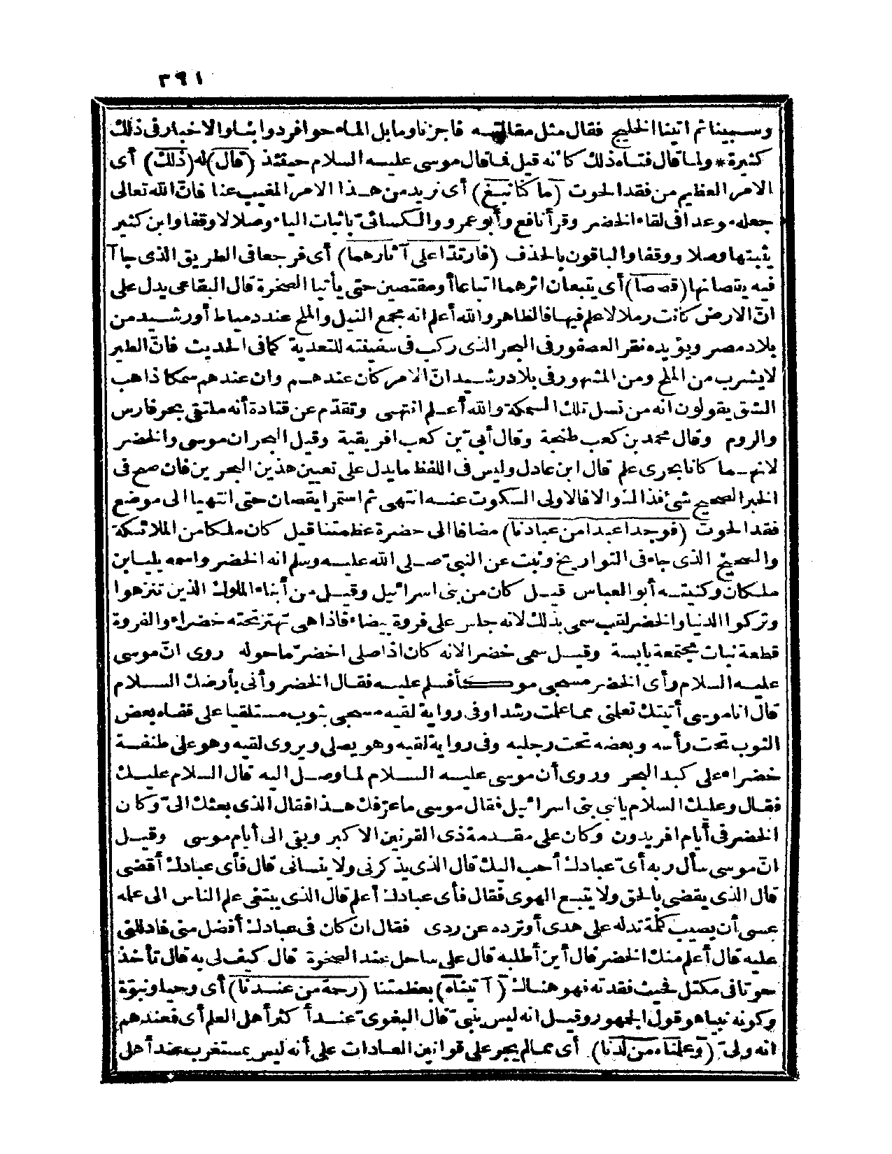 موسى عليه السلام رأى الخضر مسجى موكأ فسلم عليه فقال الخضر: وأني بأرضك السلام، قال: أنا موسى أتيتك تعلمني مما علمت رشداً، وفي رواية لقيه وهو مسجى بثوب مستلقياً على قفاه بعض الثوب تحت رأسه وبعضه تحت رجليه، وفي رواية لقيه وهو يصلي، ويروى لقيه وهو على طنفسة خضراء على كبد البحر، وروي أن موسى عليه السلام لما وصل إليه قال: السلام عليك، فقال: وعليك السلام يا نبي بني إسرائيل، فقال موسى: ما عرّفك هذا؟ فقال: الذي بعثك إليّ، وكان الخضر في أيام أفريدون وكان على مقدمة ذي القرنين الأكبر وبقي إلى أيام موسى، وقيل: إن موسى سأل ربه أيّ عبادك أحب إليك؟ قال: «الذي يذكرني ولا ينساني» ، قال: فأي عبادك أقضى؟ قال: «الذي يقضي بالحق ولا يتبع الهوى» فقال: فأي عبادك أعلم؟ قال: «الذي يبتغي علم الناس إلى علمه عسى أن يصيب كلمة تدله على هدى أو ترده عن ردى» ، فقال: إن كان في عبادك أفضل مني فادللني عليه قال: أعلم منك الخضر، قال: أين أطلبه؟ قال: على ساحل عند الصخرة، قال كيف لي به؟ قال: تأخذ حوتاً في مكتل فحيث فقدته فهو هناك {آتيناه} بعظمتنا {رحمة من عندنا} أي: وحياً ونبوة وكونه نبياً هو قول الجمهور، وقيل: إنه ليس بنبي. قال البغوي: عند أهل العلم أي: فعندهم أنه وليّ {وعلمناه من لدنا} أي: مما لم يجر على قوانين العادات على أنه ليس بمستغرب عند أهل