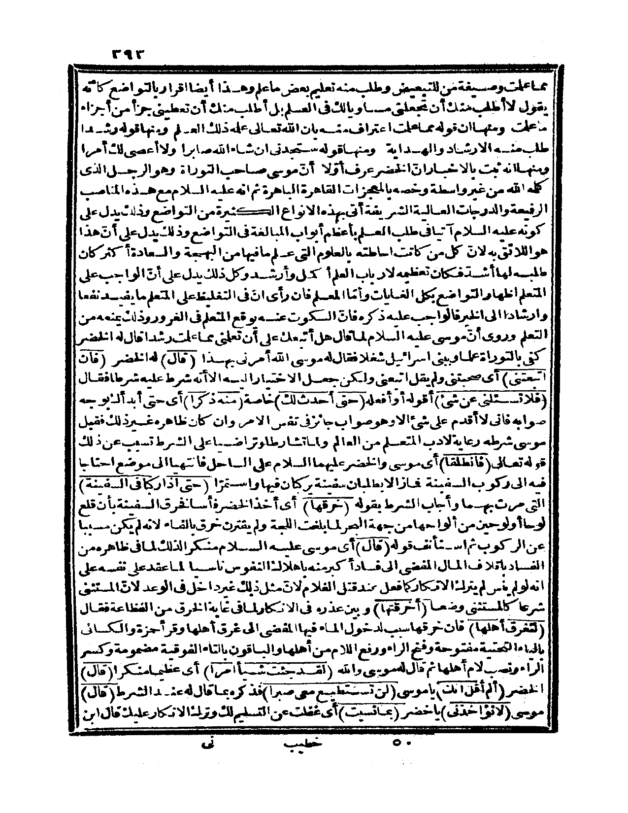 {قال} له الخضر: {فإن اتبعتني} أي: صحبتني ولم يقل اتبعني ولكن جعل الاختيار إليه إلا أنه شرط عليه شرطاً فقال: {فلا تسألني عن شيء} أقوله أو أفعله {حتى أحدث لك} خاصة {منه ذكراً} أي: حتى أبدأك بوجه صوابه فإني لا أقدم على شيء إلا وهو صواب جائز في نفس الأمر، وإن كان ظاهره غير ذلك فقبل موسى شرطه رعاية لأدب المتعلم من العالم، ولما تشارطا وتراضيا على الشرط تسبب عن ذلك قوله تعالى: {فانطلقا} أي: موسى والخضر عليهما السلام على الساحل فانتهيا إلى موضع احتاجا فيه إلى ركوب السفينة فما زالا يطلبان سفينة يركبان فيها واستمرّا {حتى إذا ركبا في السفينة} التي مرت بهما وأجاب الشرط بقوله: {خرقها} أي: أخذ الخضر فأساً فخرق السفينة بأن قلع لوحاً أو لوحين من ألواحها من جهة البحر لما بلغت اللجة ولم يقترن خرق بالفاء لأنه لم يكن مسبباً عن الركوب، ثم استأنف قوله: {قال} أي: موسى عليه السلام منكراً لذلك لما في ظاهره من الفساد بإتلاف المال المفضي إلى فساد أكبر منه بإهلاك النفوس ناسياً لما عقد على نفسه على أنه لو لم ينسَ لم يترك الإنكار كما فعل عند قتل الغلام لأن مثل ذلك غير داخل في الوعد، لأنّ المستثنى شرعاً كالمستثنى وضعاً {أخرقتها} وبين عذره في الإنكار لما في غاية الخرق من الفظاعة فقال: {لتغرق أهلها} فإن خرقها سبب لدخول الماء فيها المفضي إلى غرق أهلها، وقرأ حمزة والكسائي بالياء التحتية مفتوحة وفتح الراء ورفع اللام من أهلها والباقون بالتاء الفوقية مضمومة وكسر الراء ونصب لام أهلها، ثم قال له موسى: والله {لقد جئت شيئاً أمراً} أي: عظيماً منكراً.