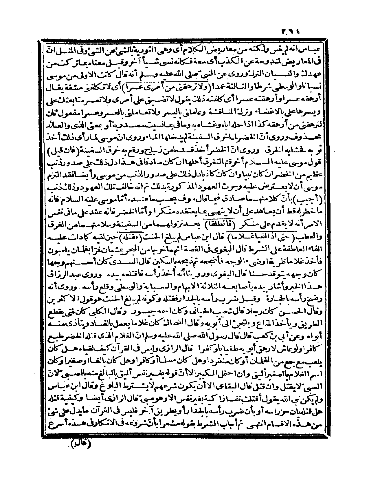 عباس: إنه لم ينس ولكنه من معاريض الكلام أي: وهي التورية بالشيء عن الشيء، وفي المثل: إنّ في المعاريض لمندوحة عن الكذب، أي: سعة فكأنه نسي شيئاً آخر وقيل معناه بما تركت من عهدك والنسيان الترك. وروي عن النبي صلى الله عليه وسلم أنه قال: «كانت الأولى من موسى نسياناً والوسطى شرطاً والثالثة عمداً» {ولا ترهقني من أمري عسراً} أي: لا تكلفني مشقة يقال: أرهقه عسراً وأرهقته عسراً أي: كلفته ذلك، يقول: لا تضيق علي أمري ولا تعسر متابعتك علي ويسرها علي بالإغضاء وترك المناقشة وعاملني باليسر ولا تعاملني بالعسر، وعسراً مفعول ثان لترهقني من أرهقه كذا إذا حمله إياه وغشاه به وما في بما نسيت مصدرية أو بمعنى الذي والعائد محذوف. وروي أن الخضر لما خرق السفينة لم يدخلها الماء، وروي أن موسى لما رأى ذلك أخذ ثوبه فحشا به الخرق، وروي أن الخضر أخذ قدحاً من زجاج ورقع به خرق السفينة فإن قيل: قول موسى عليه السلام أخرقتها لتغرق أهلها إن كان صادقاً في هذا دل ذلك على صدور ذنب عظيم من الخضر إن كان نبياً، وإن كان كاذباً دل ذلك على صدور الذنب من موسى وأيضاً فقد التزم موسى أن لا يعترض عليه وجرت العهود المذكورة بذلك ثم إنه خالف تلك العهود وذلك ذنب أجيب: بأن كلاً منهما صادق فيما قال موف بحسب ما عنده، أما موسى عليه السلام فإنه ما خطر له قط أن يعاهد على أن لا ينهى بما يعتقده منكراً، وأما الخضر فإنه عقد على ما في نفس الأمر أنه لا يقدم على منكر.