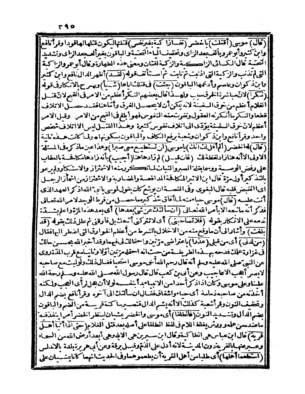 {قال} موسى: {أقتلت} يا خضر {نفساً زاكية بغير نفس} قتلتها ليكون قتلها لها قوداً، وقرأ نافع وابن كثير وأبو عمرو بألف بعد الزاي وتخفيف الياء التحتية والباقون بغير ألف بعد الزاي وتشديد التحتية، قال الكسائي: الزاكية والزكية لغتان ومعنى هذه الطهارة، وقال أبو عمرو: الزاكية التي لم تذنب والزكية التي اذنبت ثم تابت ثم استأنف قوله: {لقد} أظهر الدال نافع وابن كثير وابن ذكوان وعاصم وأدغمها الباقون {جئت} في قتلك إياها {شيئاً} وصرح بالإنكار في قوله: {نكراً} لأن مباشرة الخرق سبب، ولهذا قال بعضهم: النكر أعظم من الأمر في القبح لأن قتل الغلام أعظم من خرق السفينة لأنه يمكن أن لا يحصل الغرق، وأمّا هنا فقد حصل الإتلاف قطعاً، والنكر ما أنكرته العقول ونفرت منه النفوس فهو أبلغ في القبح من الأمر، وقيل: الأمر أعظم لأن خرق