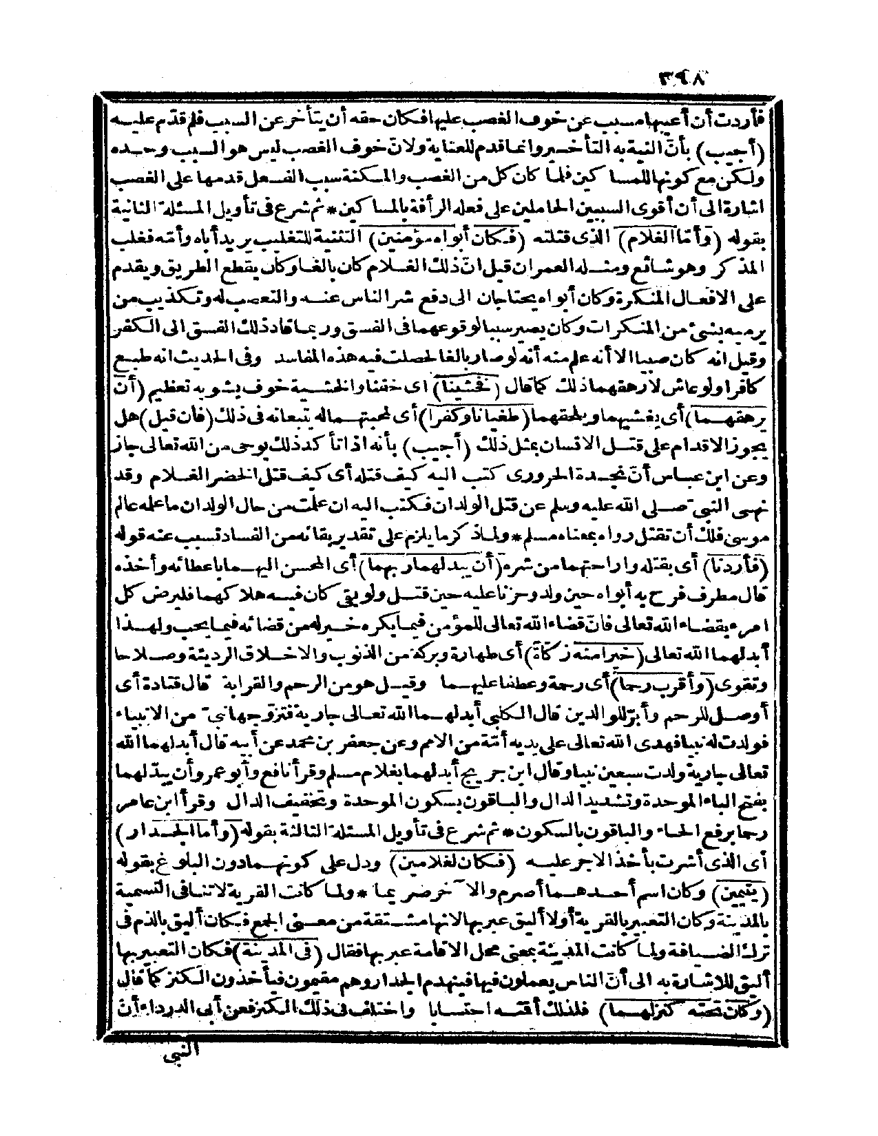 {وأمّا الغلام} الذي قتلته {فكان أبواه مؤمنين} التثنية للتغليب يريد أباه وأمه فغلب المذكر وهو شائع ومثله العمران، قيل: إن ذلك الغلام كان بالغاً وكان يقطع الطريق ويقدم على الأفعال المنكرة، وكان أبواه يحتاجان إلى دفع شر الناس عنه والتعصب له وتكذيب من يرميه بشيء من المنكرات وكان يصير سبباً لوقوعهما في الفسق وربما قاد ذلك الفسق إلى الكفر، وقيل: إنه كان صبياً إلا أنه علم منه أنه لو صار بالغاً لحصلت فيه هذه المفاسد، وفي الحديث أنه طبع كافراً ولو عاش لأرهقهما ذلك كما قال {فخشينا} أي: خفنا، والخشية خوف يشوبه تعظيم {أن يرهقهما} أي: يغشيهما ويلحقهما {طغياناً وكفراً} أي: لمحبتهما له يتبعانه في ذلك فإن قيل: هل يجوز الإقدام على قتل الإنسان بمثل ذلك؟ أجيب: بأنه إذا تأكد ذلك بوحي من الله تعالى جاز، وعن ابن عباس أن نجدة الحروري كتب إليه كيف قتله أي: كيف قتل الخضر الغلام، وقد نهى النبي صلى الله عليه وسلم عن قتل الولدان فكتب إليه: «إن علمت من حال الولدان ما علمه عالم موسى فلك أن تقتل» .